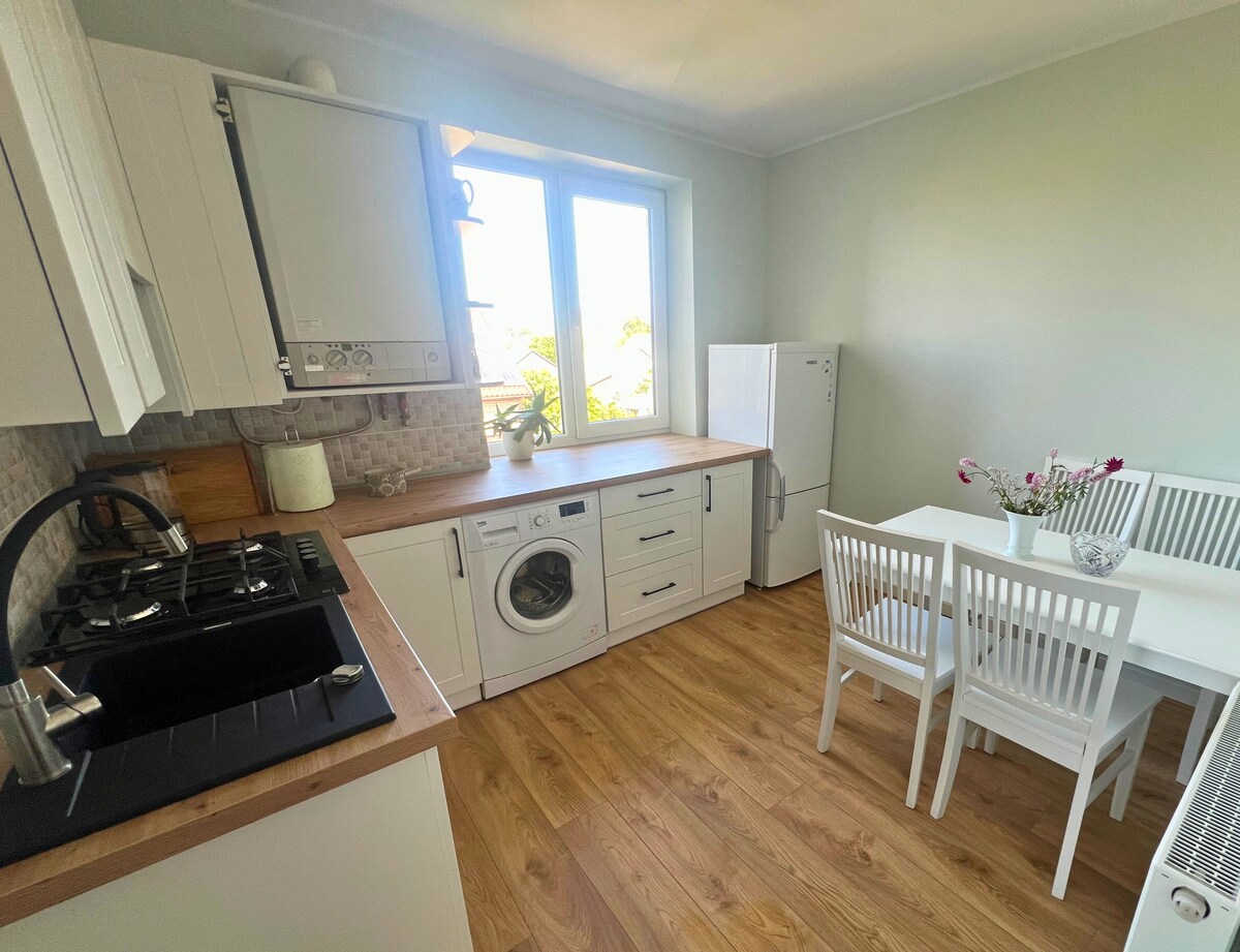 El departamento está en la parte central de la ciudad, en la región de la casa privada. Se puede llegar al centro de la ciudad con unos agradables 15-20 minutos a pie o en 3-5 minutos con el auto. También puedes usar una parada de autobús que está cerca. El espacioso apartamento de 65 metros cuadrados con la entrada independiente da la oportunidad de sentirse cómodo para familias con niños, parejas y otros viajeros. Siempre espacio libre para estacionar un coche en una calle frente a la casa.