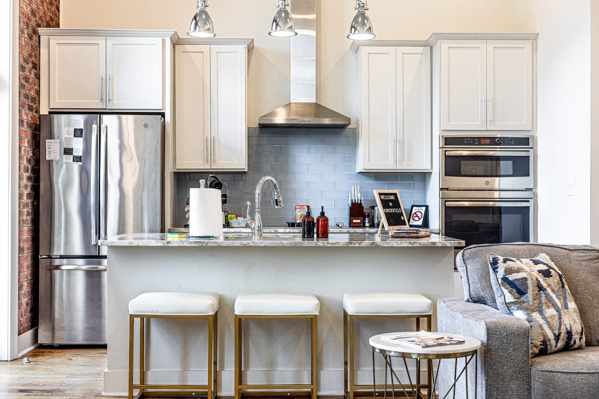 El encanto histórico se une a la elegancia moderna en este lujoso ático urbano. Relájate en la sala de estar de concepto abierto con ladrillo visto y grandes ventanales. Prepara una comida en la cocina del chef y disfruta al aire libre en la mesa de comedor exterior. Disfruta de las vistas panorámicas de la ciudad del centro de Knoxville y las colinas más allá mientras te relajas en la terraza. Reúnete alrededor de la chimenea al aire libre y disfruta de una bebida en tu propia terraza privada bajo las estrellas.