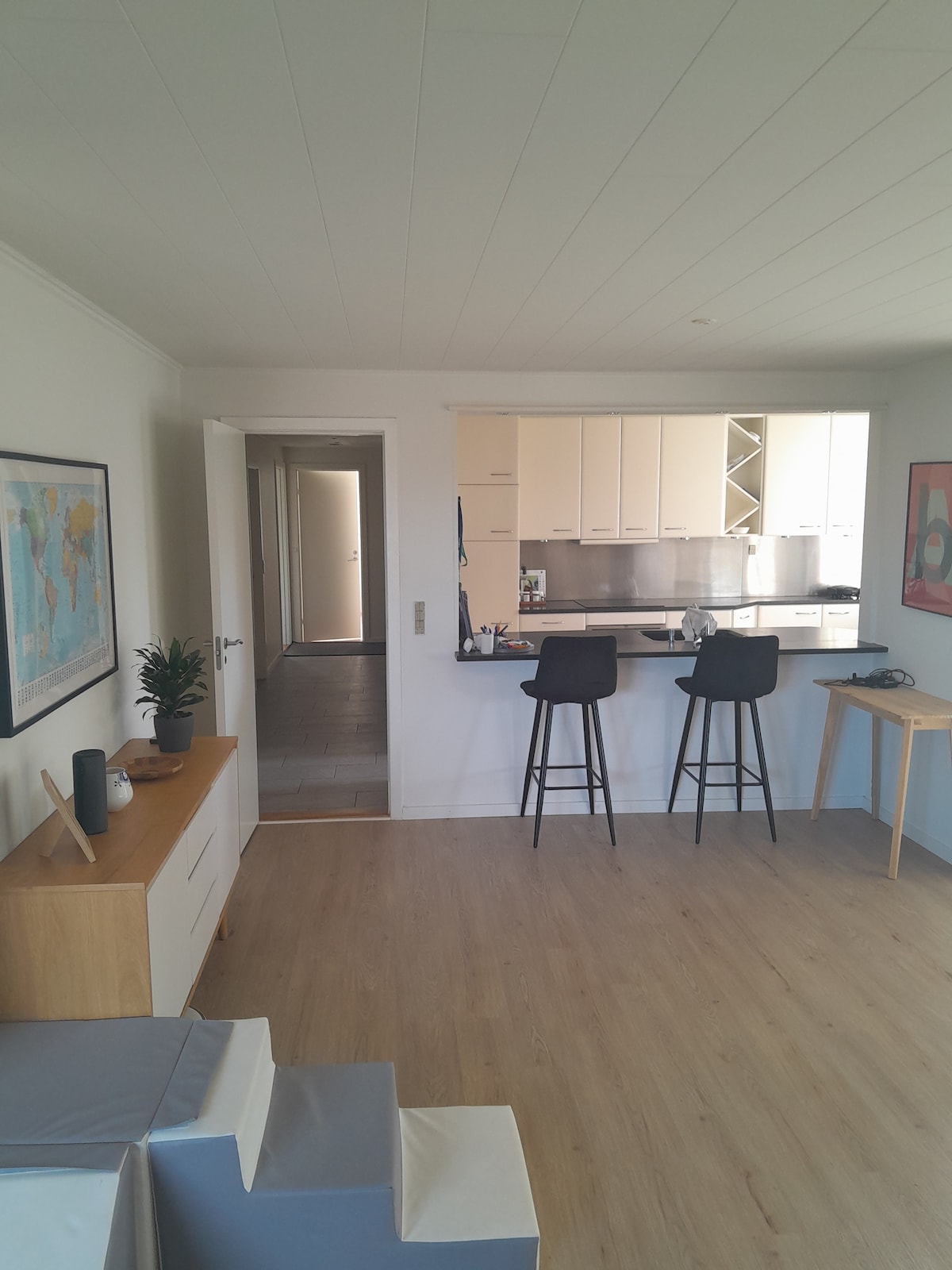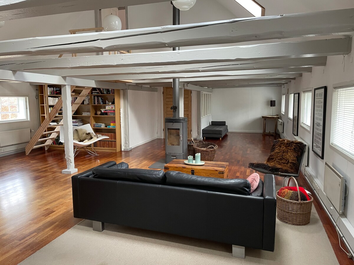Bienvenido a nuestro ático recientemente renovado en una casa del siglo XIX, ubicada en la calle principal de Køge. El ático cuenta con un dormitorio principal, una habitación de invitados con una oficina y un sofá cama, una cocina moderna y un baño. La sala de estar cuenta con una impresionante altura de techo y hermosas vigas de madera, iluminación elegante. Desde la sala de estar, puedes acceder a un pequeño balcón con parrilla de gas, que conduce a una escalera hasta tu estacionamiento privado. A solo 3 minutos a pie del tren y a 10 minutos del mar.