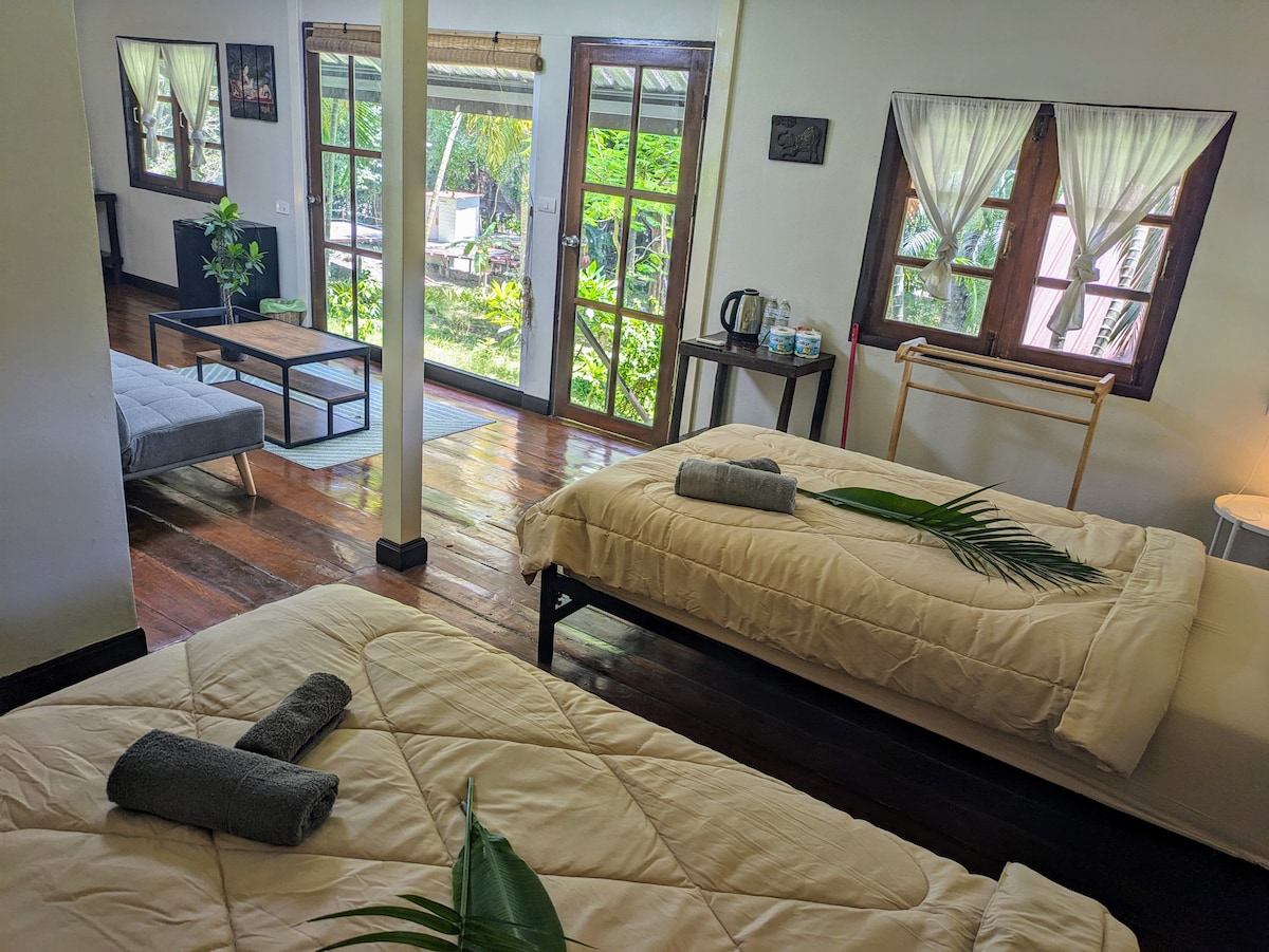 ¡Bienvenido a nuestra habitación familiar en el hermoso Koh Chang! Disfruta de impresionantes vistas al mar desde nuestro patio compartido. Esta habitación con aire acondicionado cuenta con dos camas dobles, suelo de madera, TV por cable y dos baños, cada uno con bañera y ducha. Ten en cuenta que el acceso requiere un tramo de escaleras. Perfecto para familias que buscan comodidad y valor con impresionantes vistas al mar.
