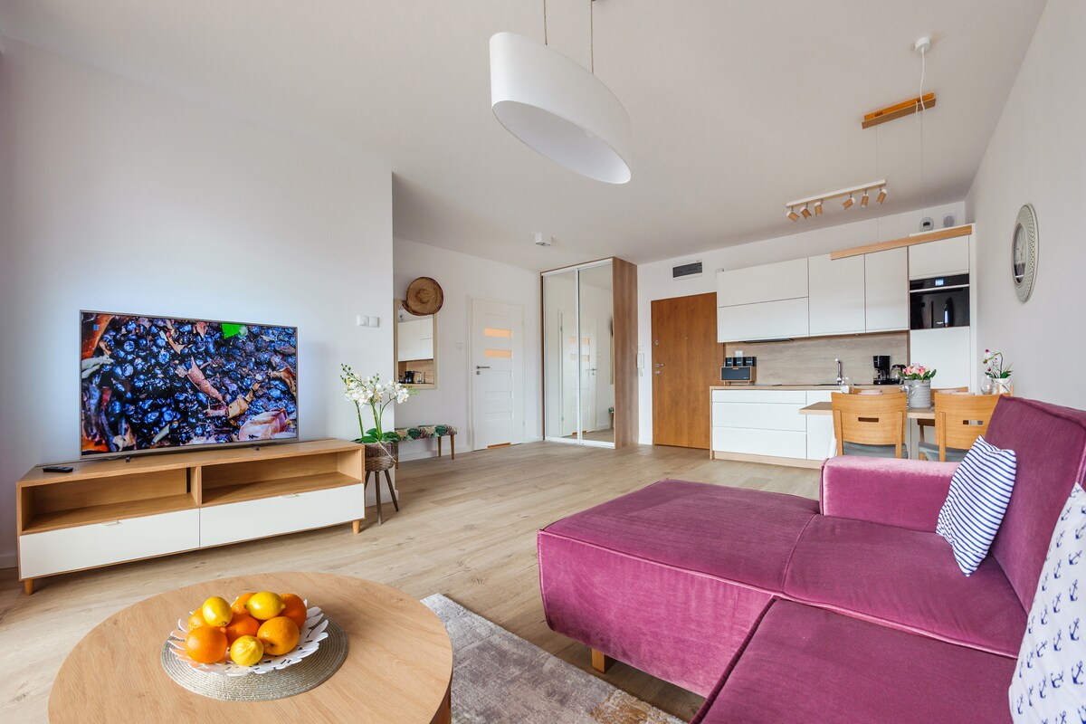 Apartamento elegante y moderno en el edificio de apartamentos Baltic Marina Residence de nueva construcción diseñado para 4 personas. Aproximadamente 41m2 incluye un dormitorio con cerradura con una cama doble de 160x200 cm, una sala de estar con sofá cama, un comedor, una cocina americana totalmente equipada y un baño con ducha. Hay una salida al balcón desde el departamento.