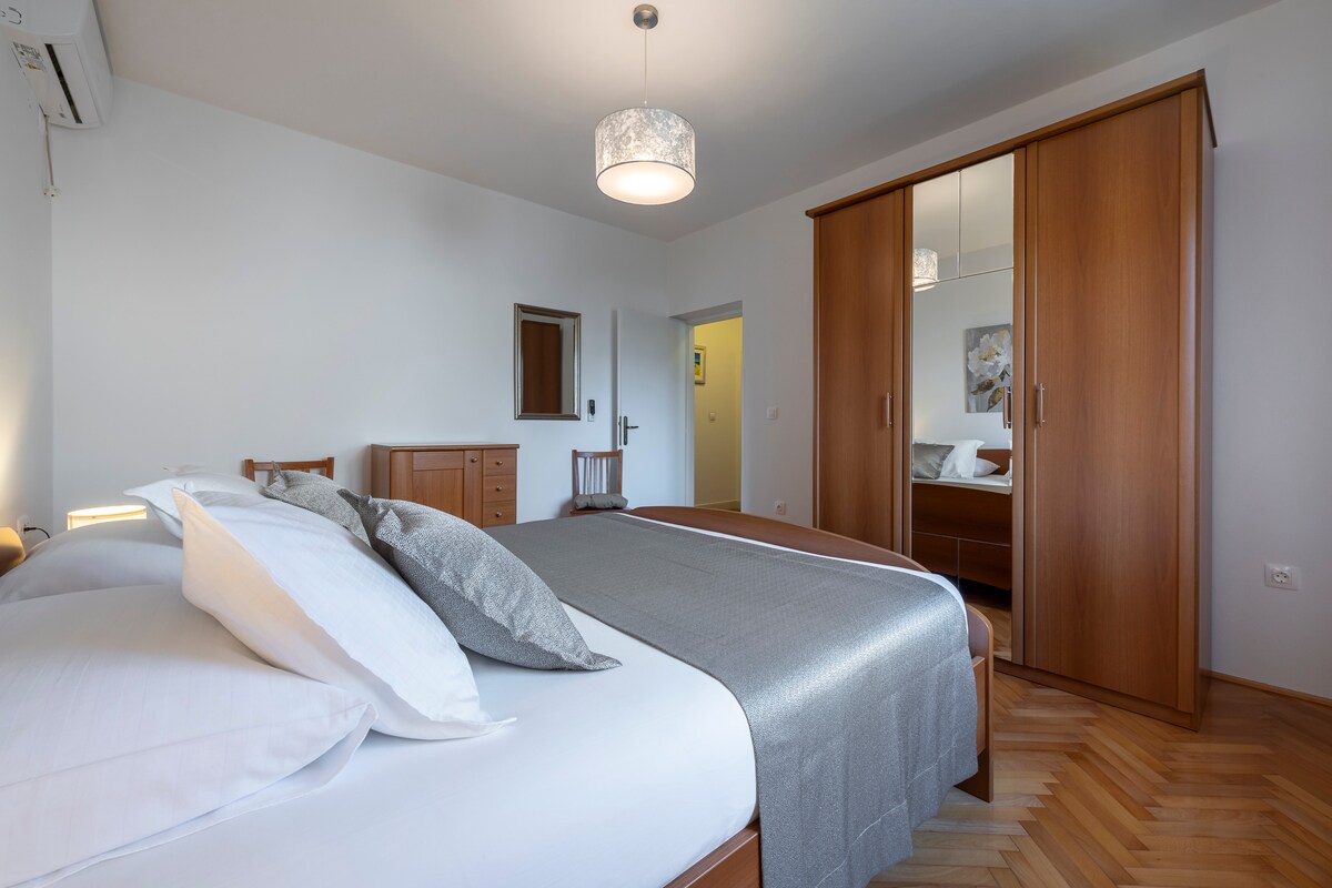Apartamento de 90 m² con vista al mar y carga gratuita de vehículos eléctricos, ubicado en el segundo piso, ideal para un máximo de 6 huéspedes. Ofrece una sala de estar con sofá cama, cocina totalmente equipada, dos dormitorios dobles y dos baños. Disfruta de dos terrazas, incluida una terraza de 12 m² con vistas al casco antiguo de Cavtat, el mar, las islas y Dubrovnik. Aire acondicionado, wifi, TV vía satélite y calefacción central incluidos. 🚗 Dos plazas de estacionamiento privado y 🔌 carga gratuita de vehículos eléctricos (infórmanos con antelación).