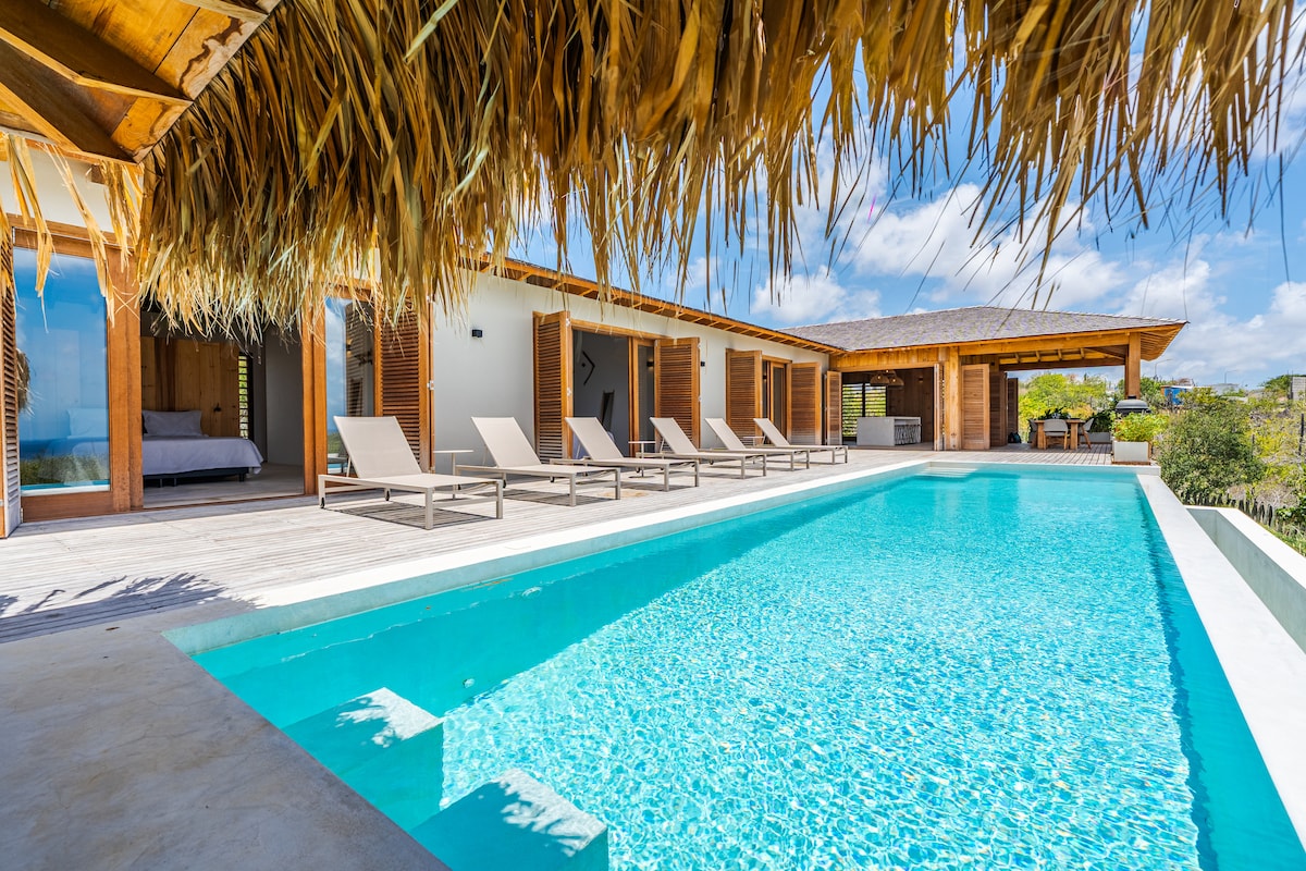 Esta villa única y céntrica (a 200 metros de Bachelors Beach) está completamente recién construida y decorada con estilo. El alquiler comienza en enero de 2026. La Villa Jardín se encuentra en el jardín tropical del Pure Bonaire Boutique Hotel junto a los apartamentos y estudios, justo al lado de la piscina. La espaciosa terraza en la azotea con cocina al aire libre y barbacoa ofrece hermosas vistas al mar, y abajo hay una hermosa terraza. Adecuado para 2 adultos (y posiblemente 2 niños a partir de 12 años).