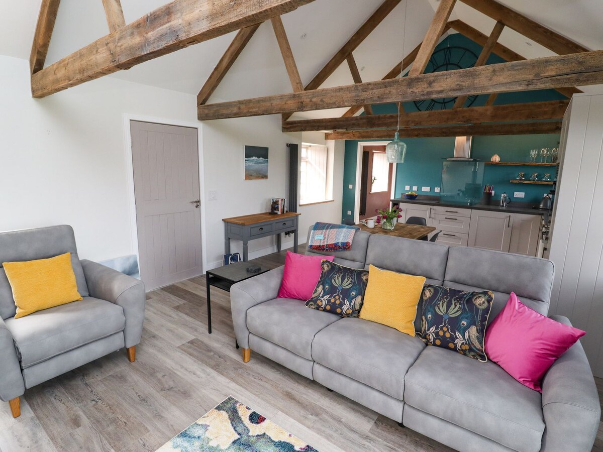 Acogedor estudio de lujo para dos personas en las afueras del pueblo con patio privado soleado, jardín con césped, cama tamaño king de espuma viscoelástica, baño privado con ducha eléctrica a ras de suelo y cocina completa con horno de ventilador, vitrocerámica de 4 fuegos, extractor, microondas y lavadora/secadora. Wifi gratuito y TV inteligente Freesat con reproductor de DVD. Chimenea eléctrica de leña. Sofá. A menos de 10 minutos a pie por la colina hasta el paseo marítimo y el pueblo con playa e instalaciones. Paz, tranquilidad y privacidad. Aparcamiento privado y espacio para girar.
