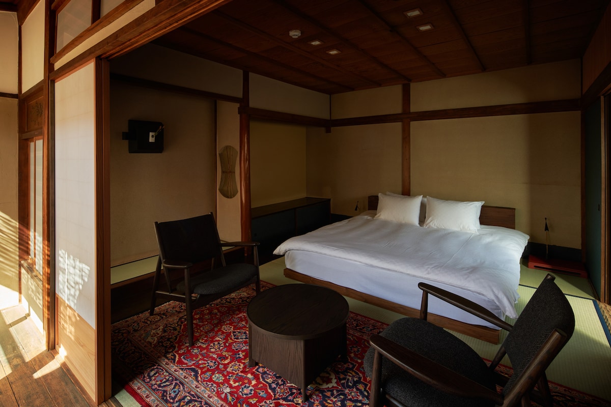 TABITABI KANOE MITSU es una posada de estilo kyomachi con más de 100 años de historia, completamente renovada y ubicada justo al lado del templo Rokumon-ji. Al mirar hacia el fondo desde la entrada, se puede ver el jardín que se extiende más allá del biombo para ver la nieve. Se caracteriza por su gran palmera. Al abrir la ventana de la sala de estar, el baño semicubierto conectado directamente al jardín invita a los huéspedes a disfrutar de la mejor curación en cualquier época del año. La bañera está hecha de cerámica Shigaraki, producida en un horno de la prefectura de Shiga. El efecto de los infrarrojos lejanos hace que el agua se enfríe con dificultad, por lo que el agua se mantiene caliente hasta el centro del cuerpo. ¿Por qué no relajarse y disfrutar de un trago mientras se admira el hermoso jardín japonés y se libera del estrés diario? La habitación japonesa del segundo piso cuenta con un biombo con un diseño de estampado de Mondrian. El cabecero del dormitorio está diseñado para recordar la cordillera de Higashiyama. Olvídese de las preocupaciones del día a día y relájese.