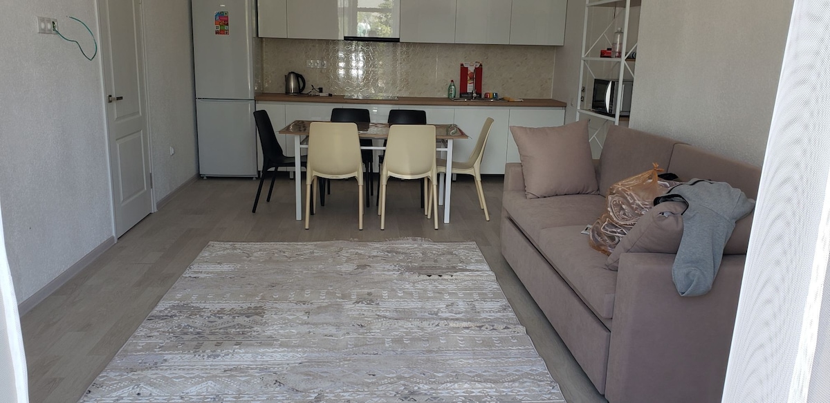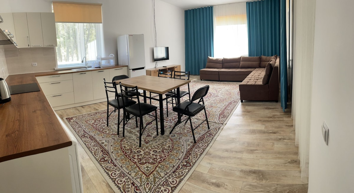 ¡Escápate al paraíso en nuestra serena casa de campo junto al lago Issyk Kul! Ubicada en el prestigioso centro vacacional Raduga West, nuestra encantadora casa de campo ofrece 2 acogedores dormitorios, una sala de estar con una cocina pequeña bien equipada y un baño moderno. Al aire libre, disfruta de un encantador lugar de barbacoa bajo las estrellas. El centro vacacional cuenta con playas vírgenes, vegetación exuberante y seguridad las 24 horas. Disfruta de las piscinas de aguas termales minerales,SPA, pesca, gimnasio, gran parque infantil y restaurantes. ¡Reserva ahora para experimentar la comodidad y la naturaleza en el lago Issyk Kul!