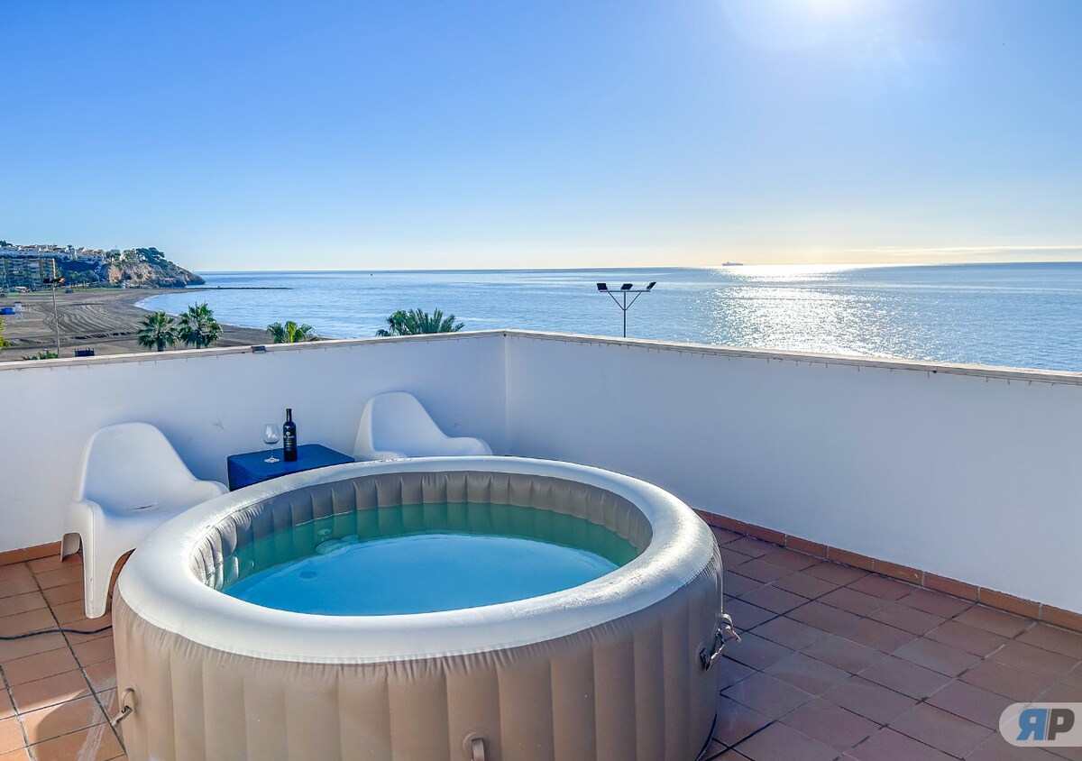 Estupendo Ático a menos de 1 minuto caminando del paseo marítimo y la playa de la Cala del Moral. Muy luminoso y soleado con orientación sur. Vistas al mar desde la terraza. Tiene dos habitaciones, una de matrimonio y otra con cama individual, un cuarto de baño, cocina equipada con todos los utensilios necesarios para cocinar y salón. Las habitaciones y el salón tienen aire acondicionado. El parking es privado, pequeño y el tamaño máximo de coche que cabe es tipo Volkswagen Golf.