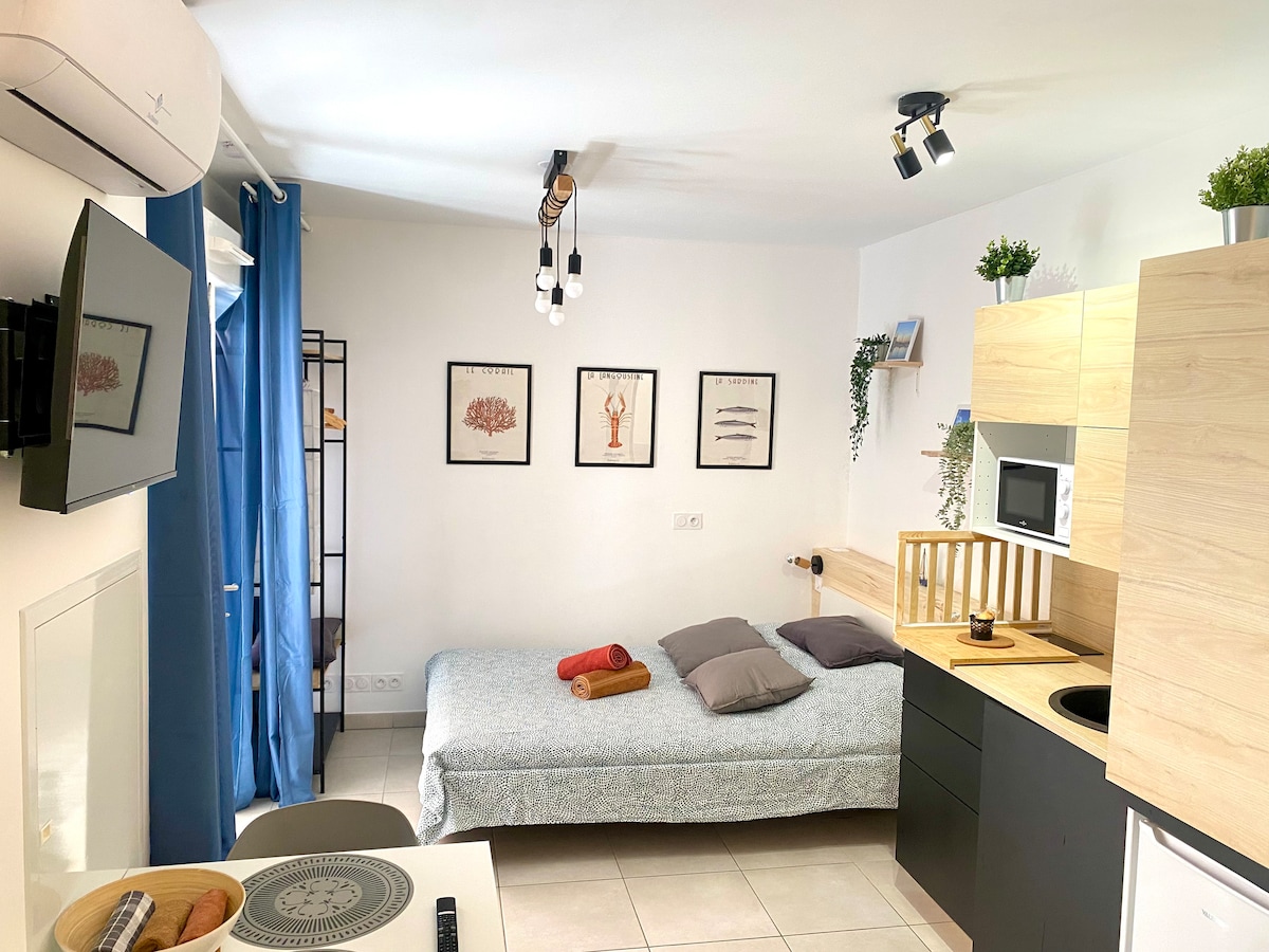 Alojamiento renovado en 2023, tranquilo, sin vecinos en un callejón cerca del centro de la ciudad, las tiendas, el astillero. Se puede ir andando a las calas en 10 minutos, el puerto viejo está a 2 minutos. Situado en una casa adosada, se accede a través de un pequeño jardín. Dispone de un dormitorio con ropa de cama nueva de 160 y pantalla plana, un sofá cama de 2 plazas en el salón, una pequeña terraza, cocina equipada, lavavajillas, máquina Nespresso. Plaza de aparcamiento seguro a 5 minutos.