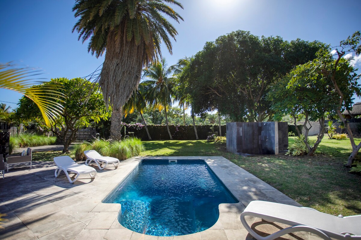 Encantadora y privada cabaña anidada en un gran jardín tropical, muy cerca (a poca distancia 300 mts, 3 mns) de la playa. Ofrece mucha privacidad, con vecinos bastante separados entre sí; te sientes como en casa. Este lugar único en Mauricio llamado Les Salines Pilot está situado en una comunidad residencial muy alta y segura, rodeada de naturaleza , río, mar y playa. Decoración boho