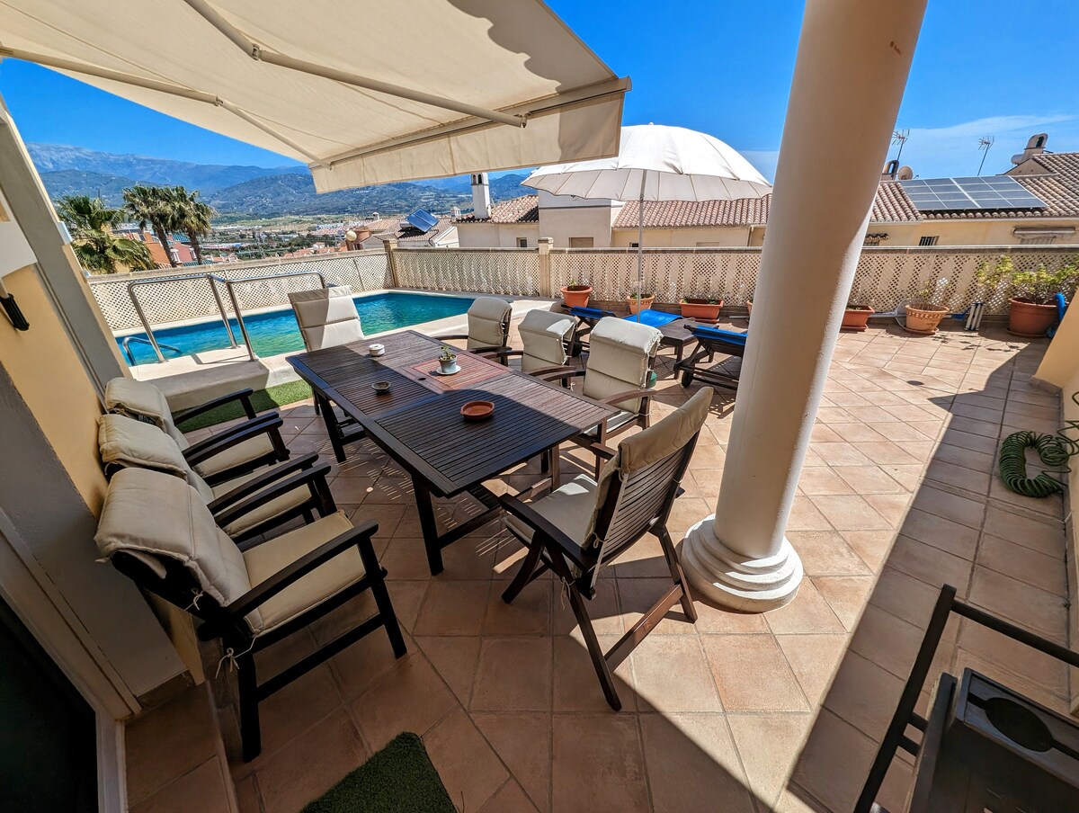 Chalet de lujo. Totalmente amueblado y equipado. 4 dormitorios 2 baños y aseo. Con WiFi. A/C, HI-FI music, T. V. . Perfecto para trabajar en remoto. Todas las habitaciones con vistas al Mediterráneo y Sierra Nevada. Terraza gigante ( solárium, comedor y chill out relax ) para disfrutar de las vistas. 2 piscinas COMUNITARIAS . y Seguridad 24 h. Paz y tranquilidad aseguradas. A 500 metros de la playa y 3 km del centro del pueblo. Esquí y playa en el día UBICACION IDEAL para excursiónes.sendas.
