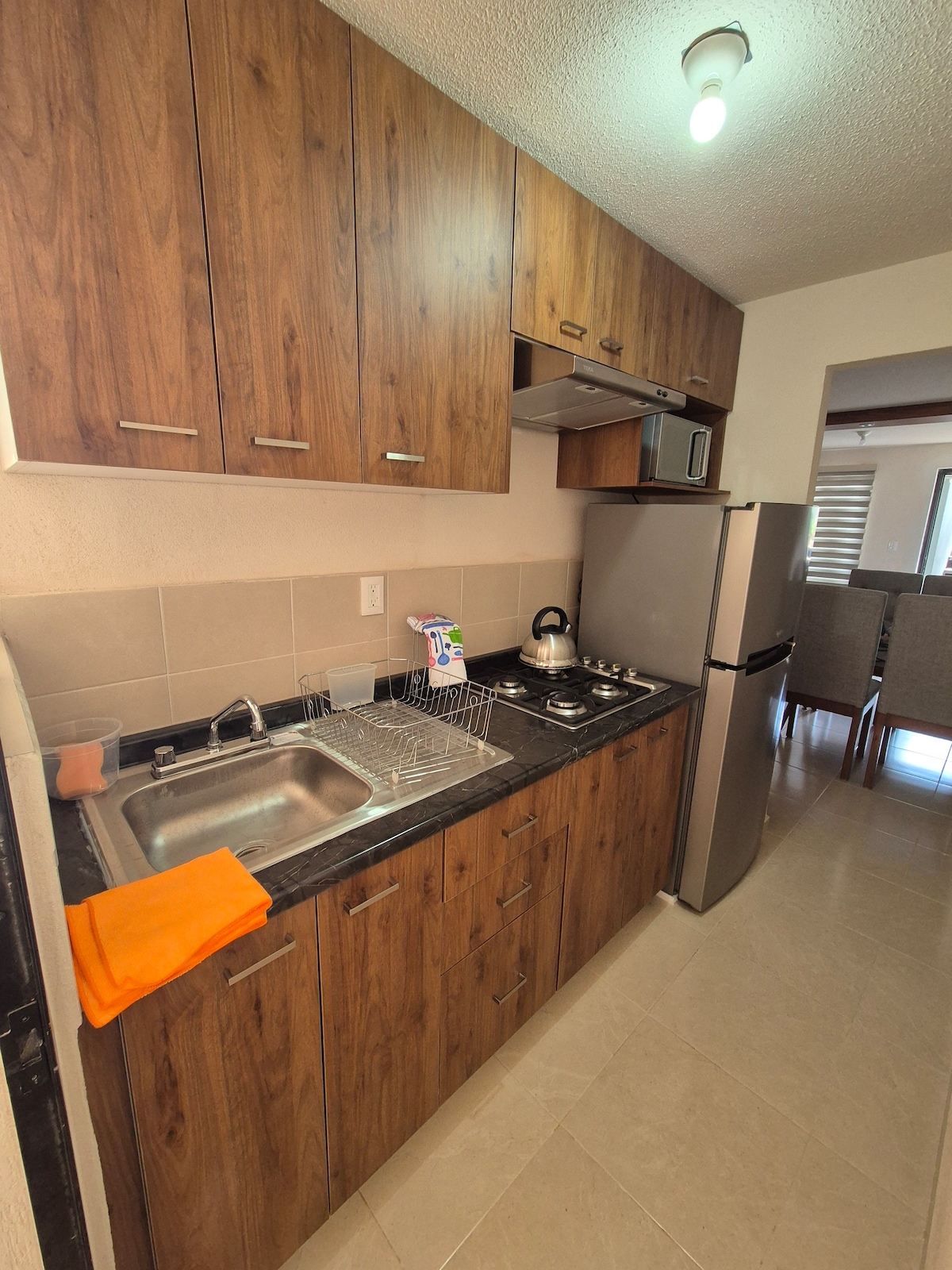 Disfruta de la sencillez de este alojamiento tranquilo y céntrico. Equipado con las necesidades básicas para una estancia cómoda; cama matrimonial, agua caliente, cocina integral, electrodomésticos básicos como frigobar, microondas, cafetera, plancha, etc. Además cerca se encuentran tiendas, médicos y farmacias, carnicerías, taquerías, papelerías y fruterías.