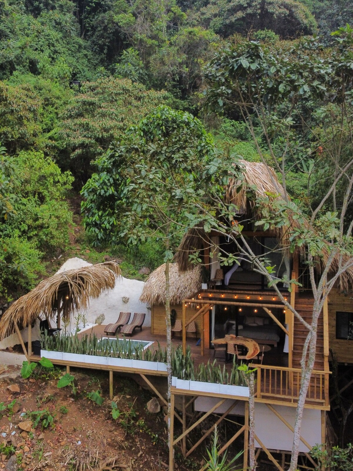 Cabaña construida en guadua y madera. Ubicada en medio de bambúes, árboles de limón, guayabas y plátanos. Desde la habitación y desde el balcón se puede contemplar una vista panorámica a Cali única. Lo más espectacular es el paisaje que se observa desde el jacuzzi privado de esta cabaña, el cual cuenta con una ventana panorámica. Desde aquí se pueden ver los paseos de los guatines con sus hijos; del pájaro carpintero taladrando ó los colibríes chupando flores silvestres nativas de farallones.