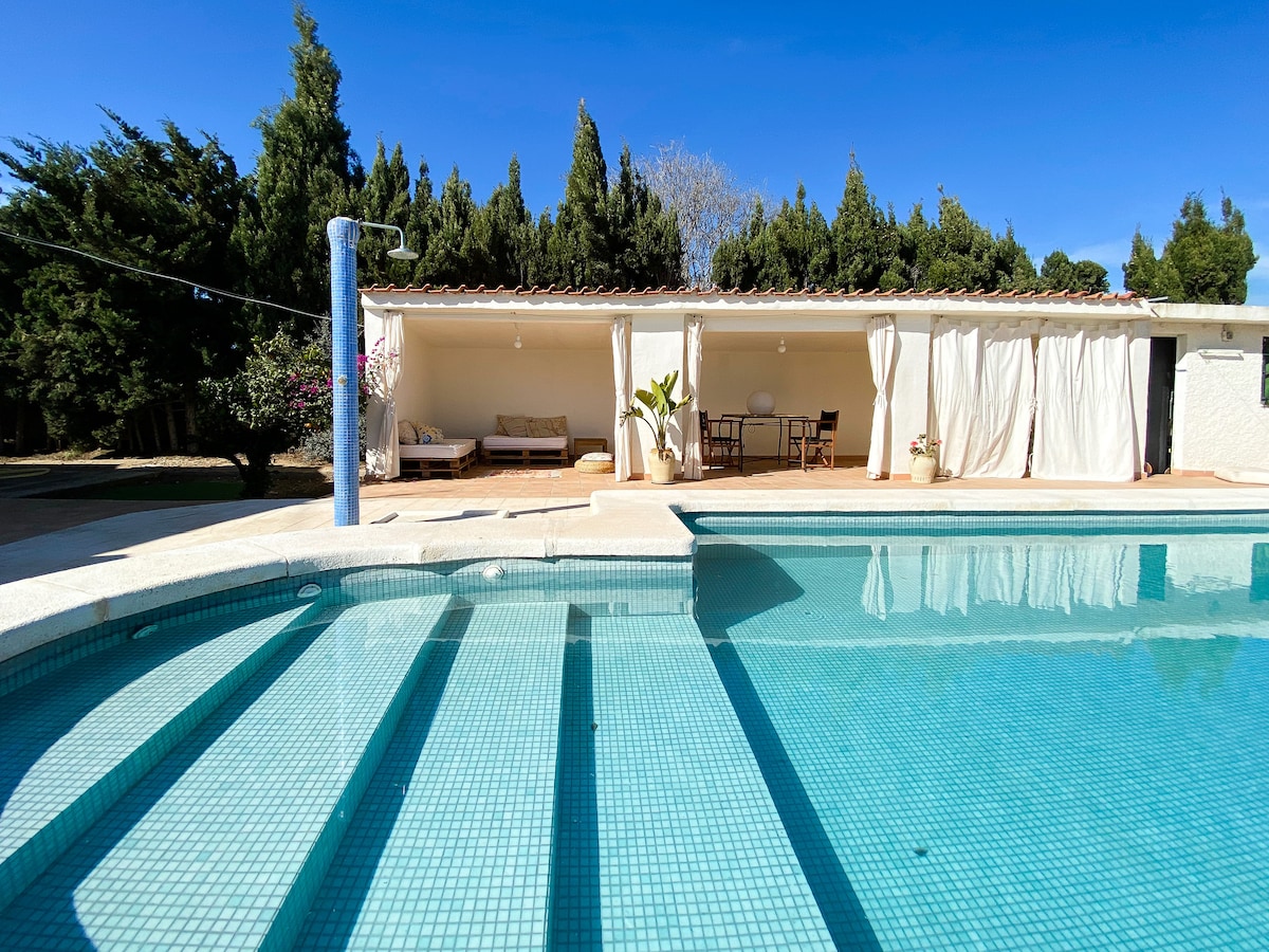 Casa refugio con piscina privada, ubicada al lado de las rutas senderisticas y puntos de escalada de Cabezó de Or y Cuevas de Canelobre. Se puede disfrutar de la tranquilidad, plena naturaleza y vistas panoramicas al mar y montaña a la vez . Ideal para pasar fin de semana haciendo deporte o para descansar. Sitio ideal para hacer barbacoa en entorno privado. A penas 12-15 km de la playa de Campello y San Juan Alicante. Casa se encuenta dentro de la finca de nuestra propiedad.