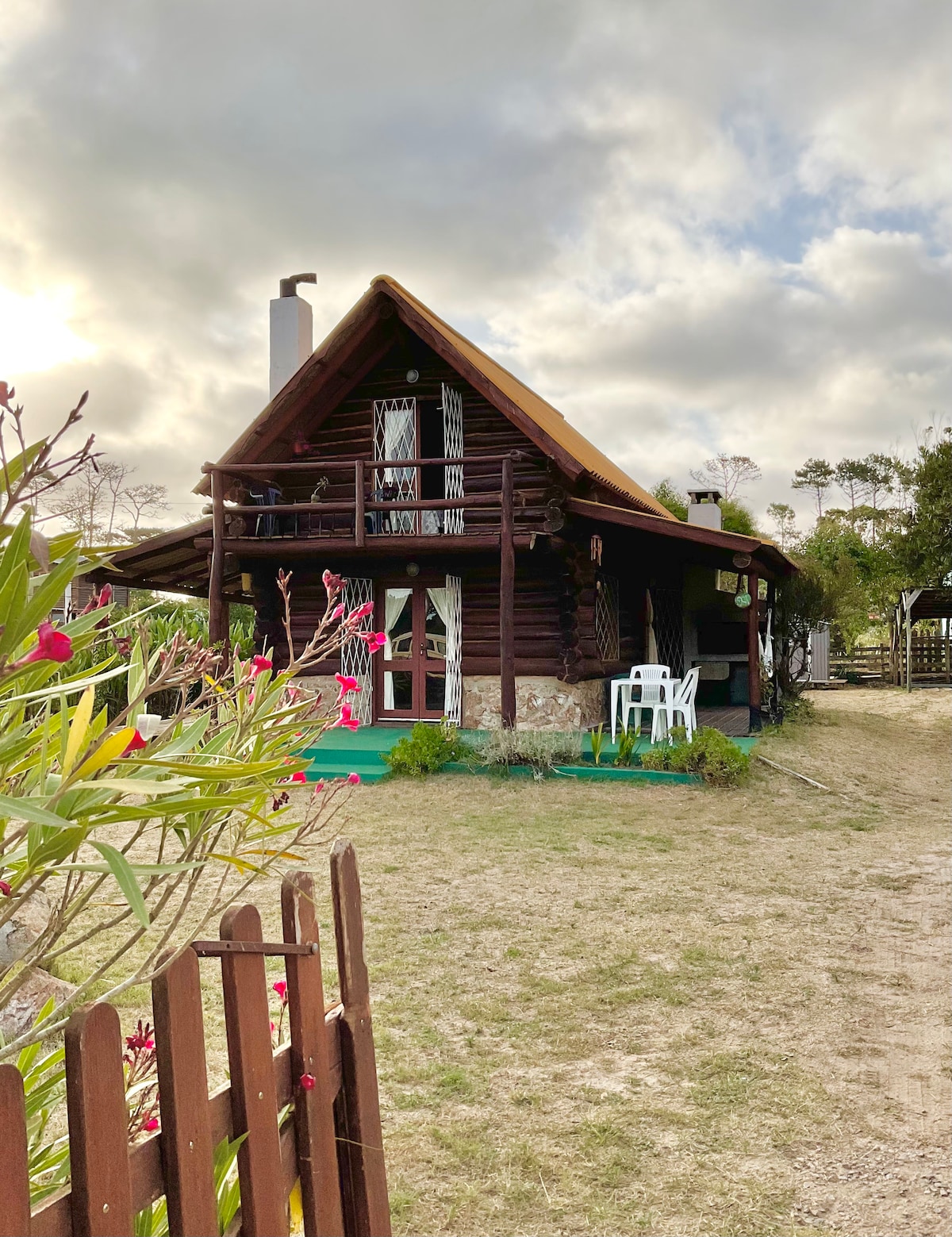 Cálida cabaña de troncos a pasos del mar. En Punta Rubia, La Pedrera, Rocha. Muy práctica, funcional y bien equipada para unas fantásticas vacaciones. Planta baja con living comedor, cocina integrada y baño completo. Muy confortable, cuenta con una estupenda estufa a leña. Planta alta con cama matrimonial y en ambiente separado, camas individuales. Dos balcones con hermosa vista al mar. Parrillero en desnivel, deck y pérgola. Deck frontal y lateral amueblado para disfutar del jardín.