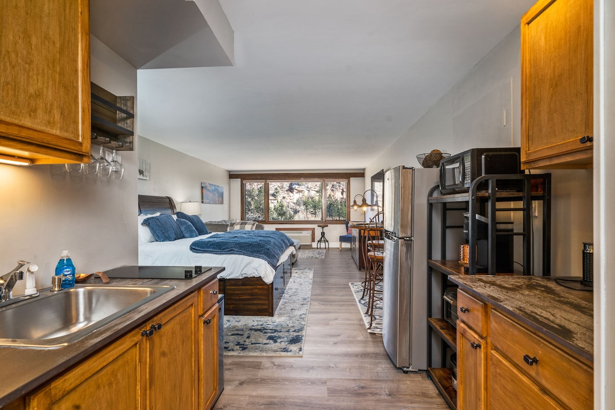 Disfruta de este complejo de condominios tipo estudio en Tamarron at Glacier Club en Durango con acceso a tres restaurantes en el lugar, piscinas cubiertas y al aire libre climatizadas, jacuzzi, gimnasio grande con clases, canchas de tenis y pickleball, parque infantil, fogatas y golf. Tendrás todo el estudio privado con baño completo. Capacidad para 5 personas, incluidos bebés: cama tamaño queen, sofá cama completo, cama plegable individual y colchón de aire tamaño queen. Debes tener más de 21 años para reservar. Solo personas agradables. 😊 ¡Reserva tu escapada a la montaña hoy mismo!