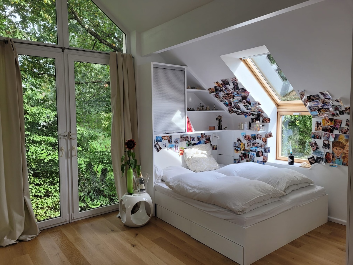 Un apartamento luminoso y amueblado individualmente con entrada privada y uso del jardín, cama doble, sala de estar y mesa te espera. Ubicación tranquila y central. Hay una pequeña cocina con nevera y cafetera, café, té. En el baño encontrarás toallas y secador de pelo. Persianas eléctricas frente a las ventanas. Wifi disponible. Muy buena conexión de autopista y autobús/tren y Vennbahnradweg. Amplio estacionamiento frente a la casa. Hay numerosas instalaciones comerciales cerca. ¡Nos vemos pronto!