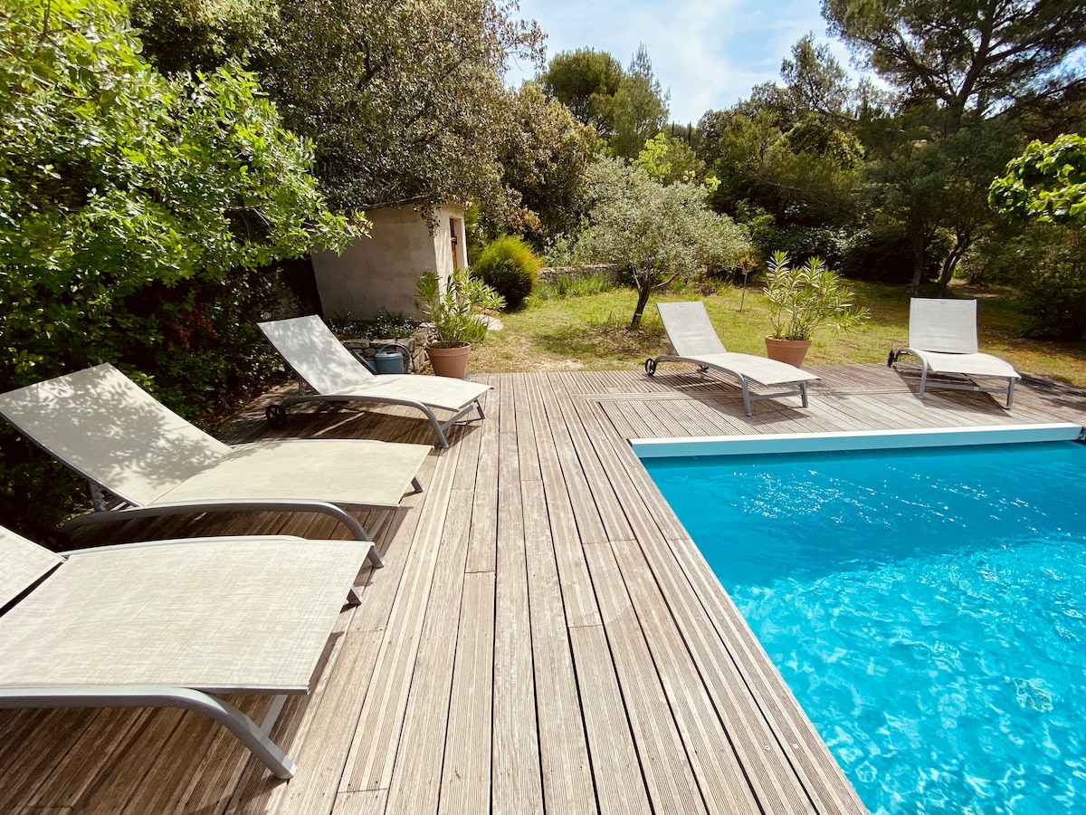 En un entorno excepcional , encantadora casa de piedra de 40 m2 en el bosque , en medio de las colinas a 10 minutos de L'Isle sur la Sorgue , en una parcela privada de 7 hectáreas a 100 metros de la casa de los propietarios , para los amantes de la naturaleza . No hay vecinos, bonita vista, hermosos muebles. Calefacción de leña. Leña incluida. Tranquilidad asegurada. Gran piscina compartida con los propietarios. WIFI por fibra.