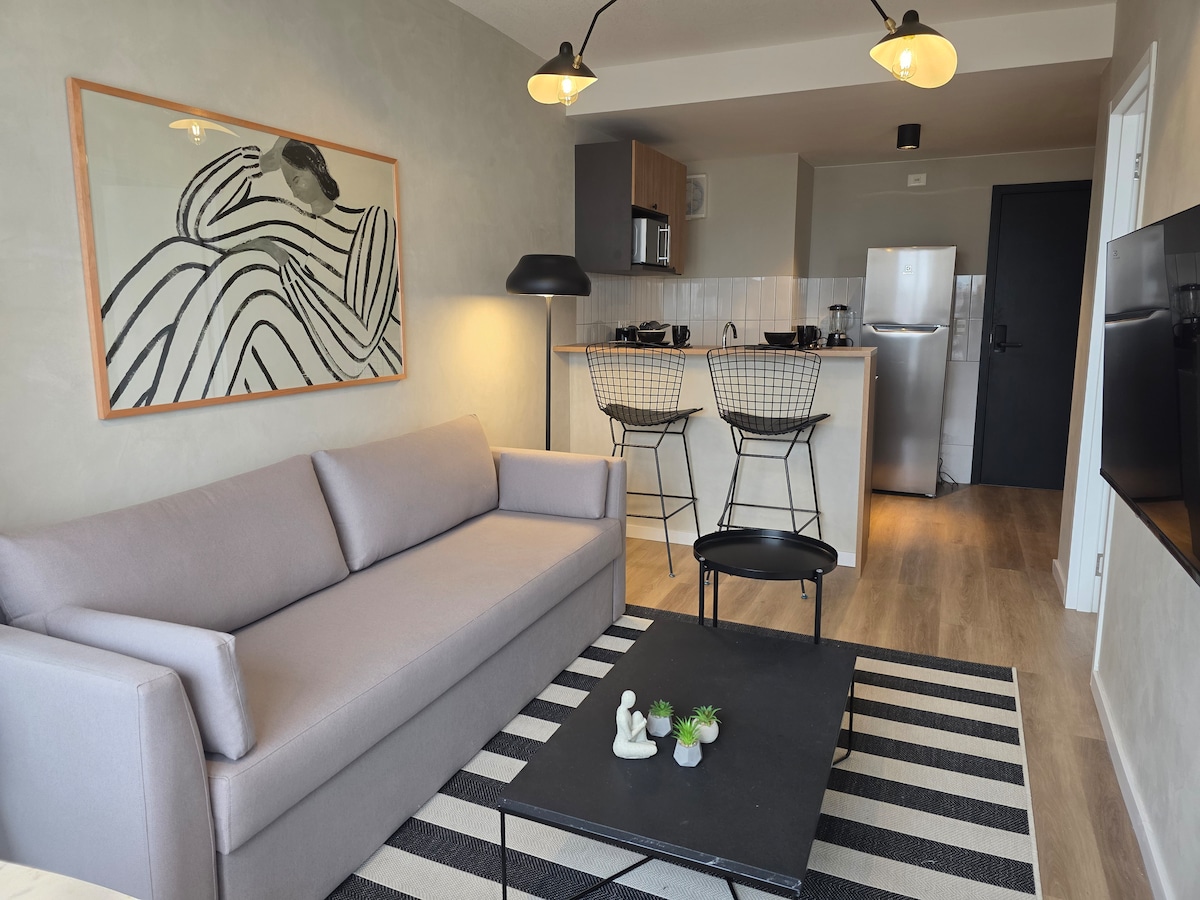 Monoambiente espacioso en edificio nuevo de diseño, con cochera. Cocina totalmente equipada, wifi rápido, living room con Smart TV de 50´, DirecTV, balcón con vista hermosa y despejada, lavarropas, cama matrimonial, baño espacioso. Terminaciones de primer nivel en edificio nuevo y moderno. Con espacio para guardar ropa y guardar tu equipaje. La locación es de las mejores de la ciudad (Golf), muy seguro, tranquilo y cerca de todo (Punta Carretas Shopping, Parque Rodó, Ciudad Vieja, Rambla).