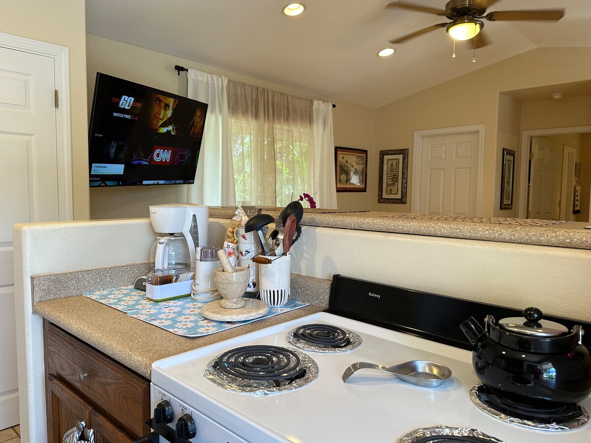 Romántico, privado, un santuario, bellamente decorado, encanto local y dormir con los sonidos del río Wailuku son algunas de las cosas que nuestros huéspedes dicen sobre nuestra posada. Una bañera de hidromasaje American Whirlpool es nuestra nueva característica junto con el aire acondicionado, lavadora/secadora, cocina completa y una gran ducha en tu baño privado. Una cama tamaño king, wifi, parrilla, televisión, ventiladores y toallas de playa son servicios estándar. ¡El cenador independiente es perfecto para leer, meditar o simplemente no hacer nada!
