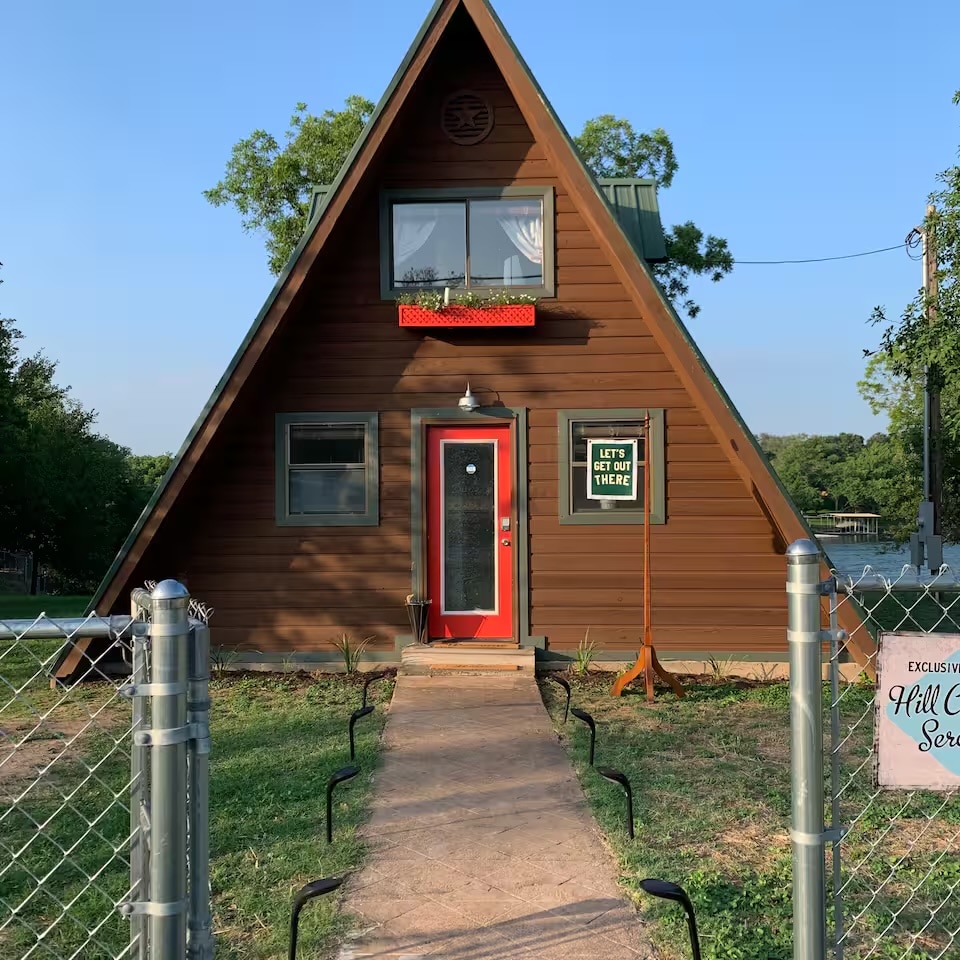 Privado con impresionantes vistas, este marco en A de los años 50 bellamente renovado en el lago LBJ es la escapada de fin de semana perfecta. Disfruta de la vida silvestre y el entorno tranquilo desde la terraza trasera o, si hace frío, quédate tostado dentro y contempla la vida silvestre mientras te acurrucas frente al fuego, escuchando álbumes vintage. Es probable que no veas a otra persona a menos que te aventures a los parques estatales y/o bodegas cercanas o a la ciudad para comprar antigüedades. Se proporcionan canoa y equipo, ¡tú traes el cebo!
