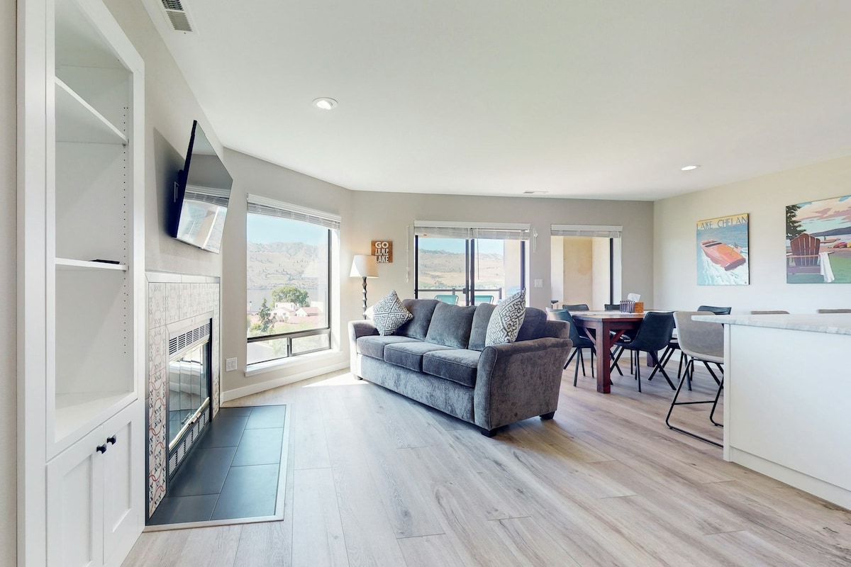 Esta propiedad es un apartamento de arriba actualizado que cuenta con dos dormitorios con camas tamaño queen, cocina totalmente equipada, cómoda sala de estar con vistas panorámicas del precioso lago Chelan. Ubicado justo al llegar a la ciudad, enfrente del agua. El apartamento está a 1/4 de milla del parque Lakeside, a 1/2 milla del parque acuático Slidewaters y muy cerca de excelentes bodegas y restaurantes. ¡Ven por el vino, quédate por las vistas!