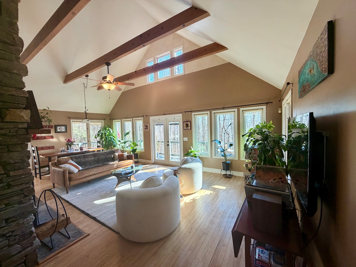 Blueberry Mountain Retreat ofrece un aislamiento tranquilo con fácil acceso a Black Mountain y Asheville, cada uno a solo 15 minutos. Disfruta del café en el porche envolvente o en el solárium para todas las estaciones, vistas a la montaña en invierno y un exuberante dosel en verano. Dos suites tamaño king con baños privados y un loft con sofá cama tamaño queen y baño completo con bañera de inmersión lo hacen ideal para parejas o grupos pequeños. Los detalles cuidados, los espacios acogedores para reunirse y el wifi rápido hacen que sea fácil relajarse o trabajar de forma remota.
