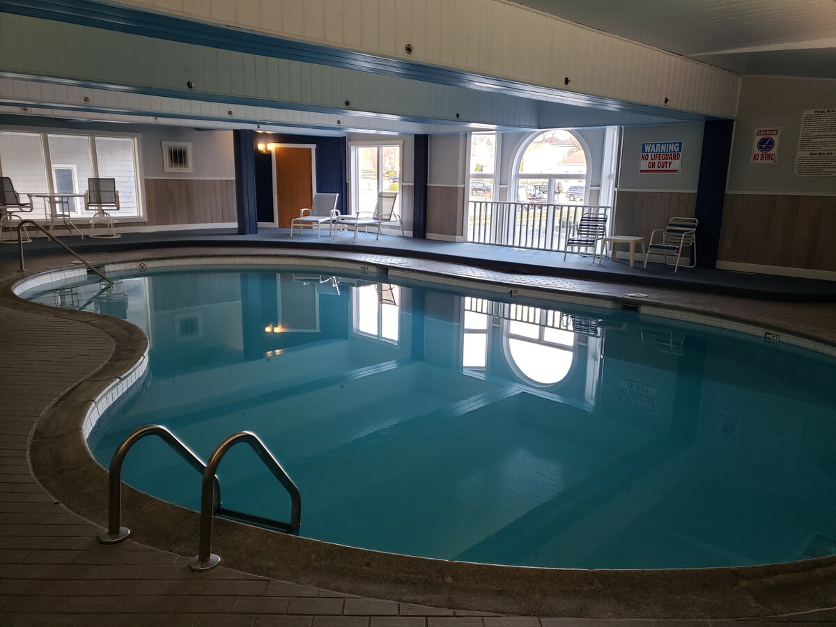 La serenidad está a pasos del agua. A solo 20 pies de la playa, el paseo marítimo y el lago, nuestro apartamento de un dormitorio y un baño en la planta baja es espacioso y funcional. El sofá de la sala de estar es un sofá cama de espuma viscoelástica. Los servicios incluyen wifi gratuito, 2 televisores con cable y una chimenea de gas. El apartamento también ofrece una piscina cubierta climatizada, gimnasio y jacuzzi. La entrada del apartamento está cerca de la entrada del edificio y del aparcamiento para facilitar la mudanza. Las tiendas y los restaurantes están a solo 1 manzana.