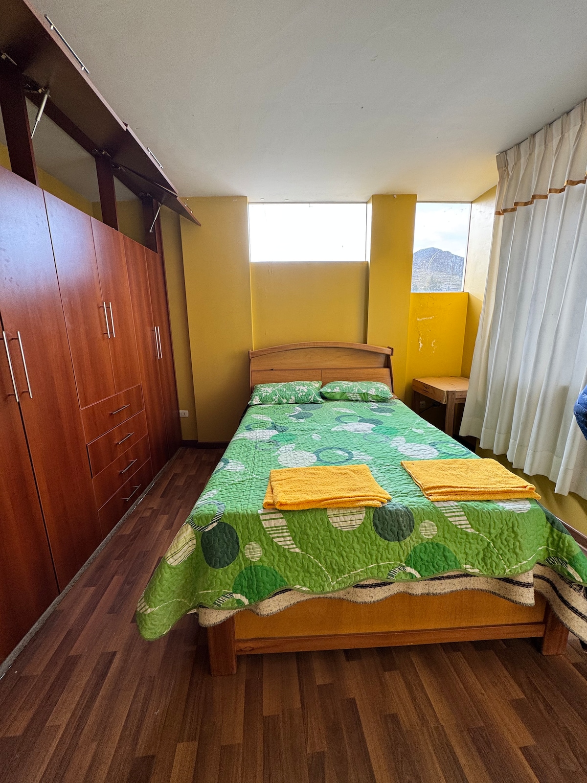 Disfruta de la sencillez de este alojamiento tranquilo y céntrico, ideal para parejas o familias cortas, ubicado a 4 cuadras de la plaza de armas, con vista a toda la ciudad, ubicado en 4to piso sin ascensor 02 camas de 02 plazas 1 baño 1 sala 1 área de trabajo 1 cocina Agua las 24 horas, agua caliente, espacios iluminados con luz natural, acabados de primera, cercanía a la plaza de armas, bancos, restaurantes y zonas turísticas.
