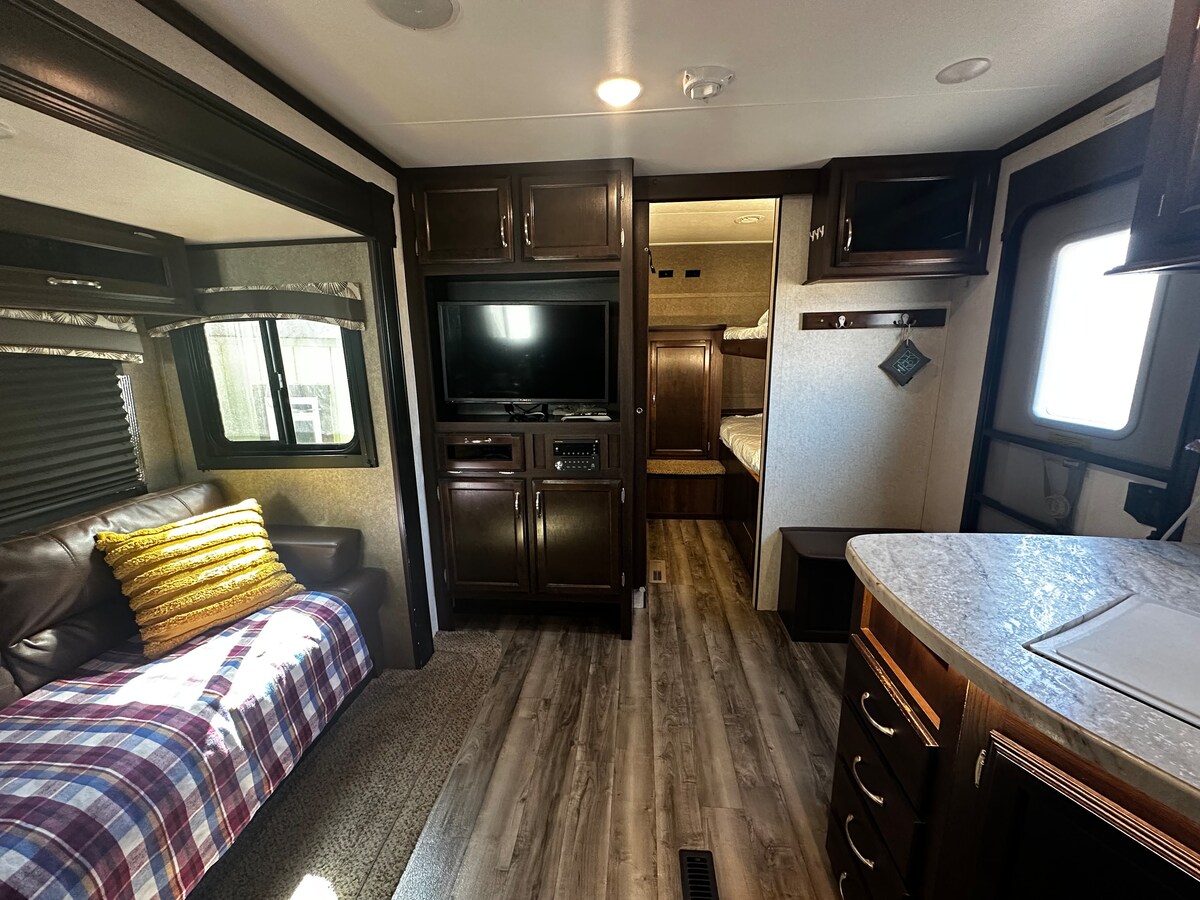 ¡Alojamiento 🏡 privado en casa rodante en 7 acres – 2 dormitorios, cerca del aeropuerto y juegos de patos! ✈️🦆 ¡Te damos la bienvenida a nuestro tranquilo refugio de autocaravanas en una propiedad privada en Eugene! 🌼 Nuestro espacioso Toy Hauler de 44 pies cuenta con dos dormitorios privados🛏️, ropa de cama mejorada, una acogedora sala de estar, una estación de café surtida ☕️ con tazas para llevar y crema, cómodos asientos al aire libre, una nueva parrilla 🍔y una fogata de temporada🔥. A 5 minutos del aeropuerto y cerca de UO🎓, Hayward Field y el centro de la ciudad. Lugar de bodas y lago Orchard Point. ¡Uber y Lyft disponibles!