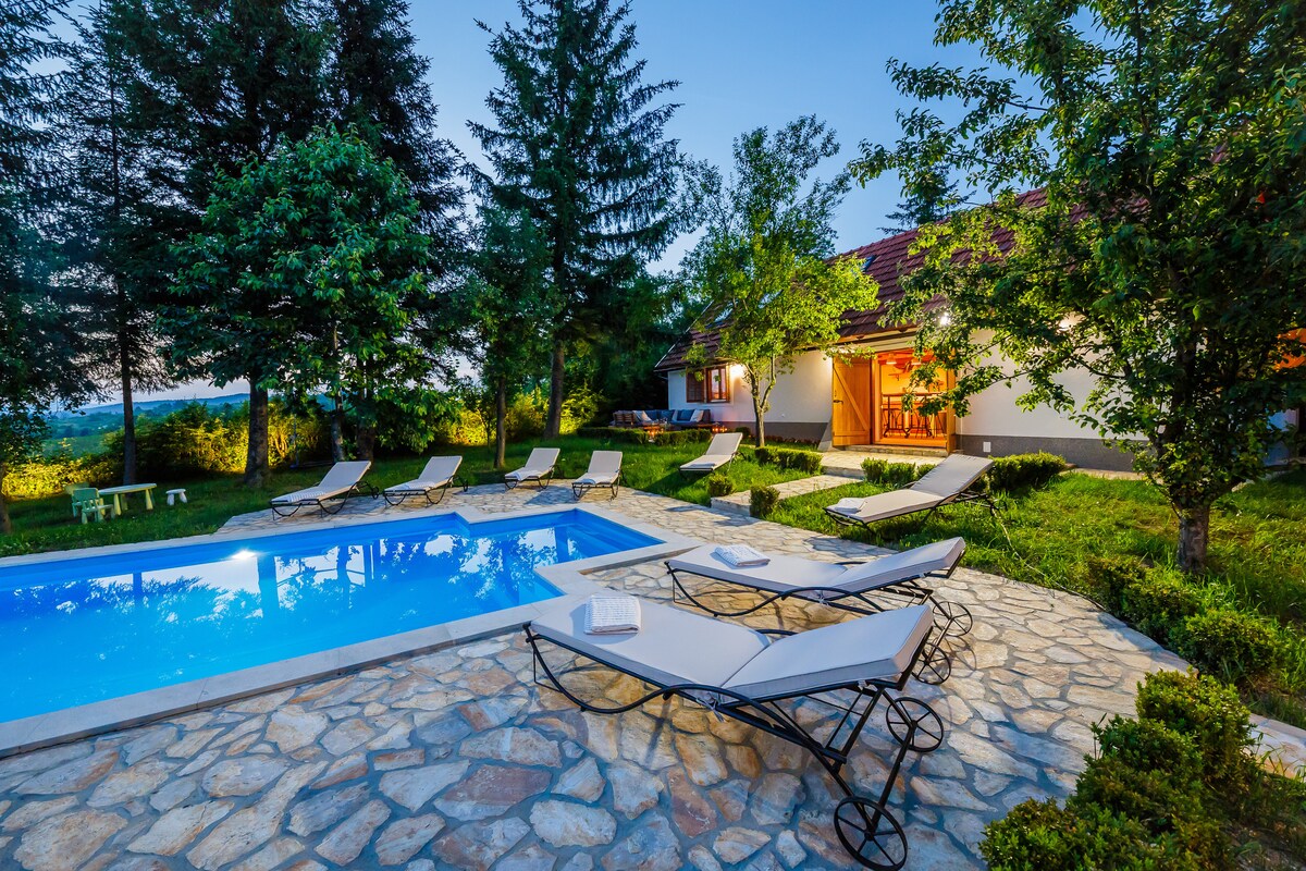 La finca VITA NATURA está situada en un entorno natural único en las inmediaciones del Parque Nacional de los Lagos de Plitvice, en una colina bañada por el sol y rodeada solo de paz y tranquilidad. La finca, ubicada en un amplio prado, consta de dos casas de madera hechas de materiales naturales y está completamente amueblada con muebles únicos de madera maciza hechos a mano por artesanos locales, lo que le da a la casa una comodidad y calidez especiales.😀