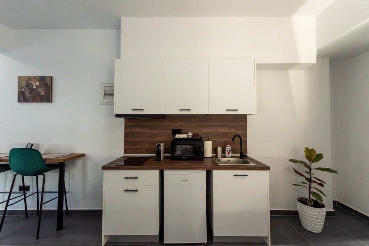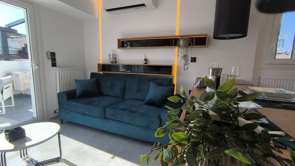 Estudio luminoso y cómodo con vistas a la plaza de Agios Konstantinos. Cama tamaño king, Netflix, cocina equipada, lavadora y check-in 24 horas con código. Ideal para parejas o viajes de negocios.