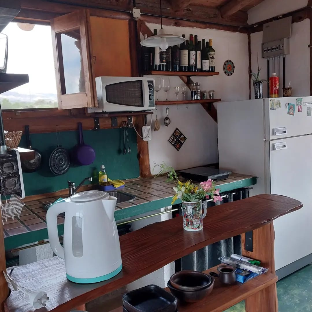 Sentite como en casa en esta cálida cabaña con vista al campo y la montaña. Ofrecemos check-in autónomo a partir de las 15 hs, sin restricciones en el horario de llegada. - Cuentas con 2 habitaciones, ambas con cama de dos plazas y estufas eléctricas. - 2 baños, uno en la habitación principal. - Living Comedor con una salamandra; te proporcionamos la leña. - Cocina totalmente equipada. - WI-Fi, Direct TV. - Estacionamiento techado para tu comodidad. ¡Las mascotas son bienvenidas! 🐶🦴