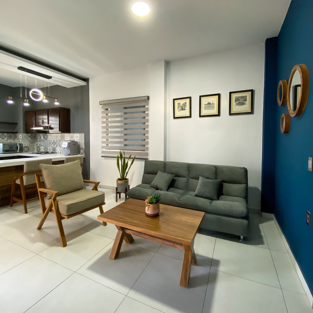 Disfruta de una experiencia con estilo en este alojamiento céntrico. Departamento de una recamara, con cama queen size y aire acondicionado. Baño completo, sala de estar, escritorio para trabajo y cocina completamente equipada; cuenta ademas con patio de servicio con lavasecadora y utensilios de limpieza. Espacio de cochera techado y con porton electrico. Departamento ubicado en segundo nivel.