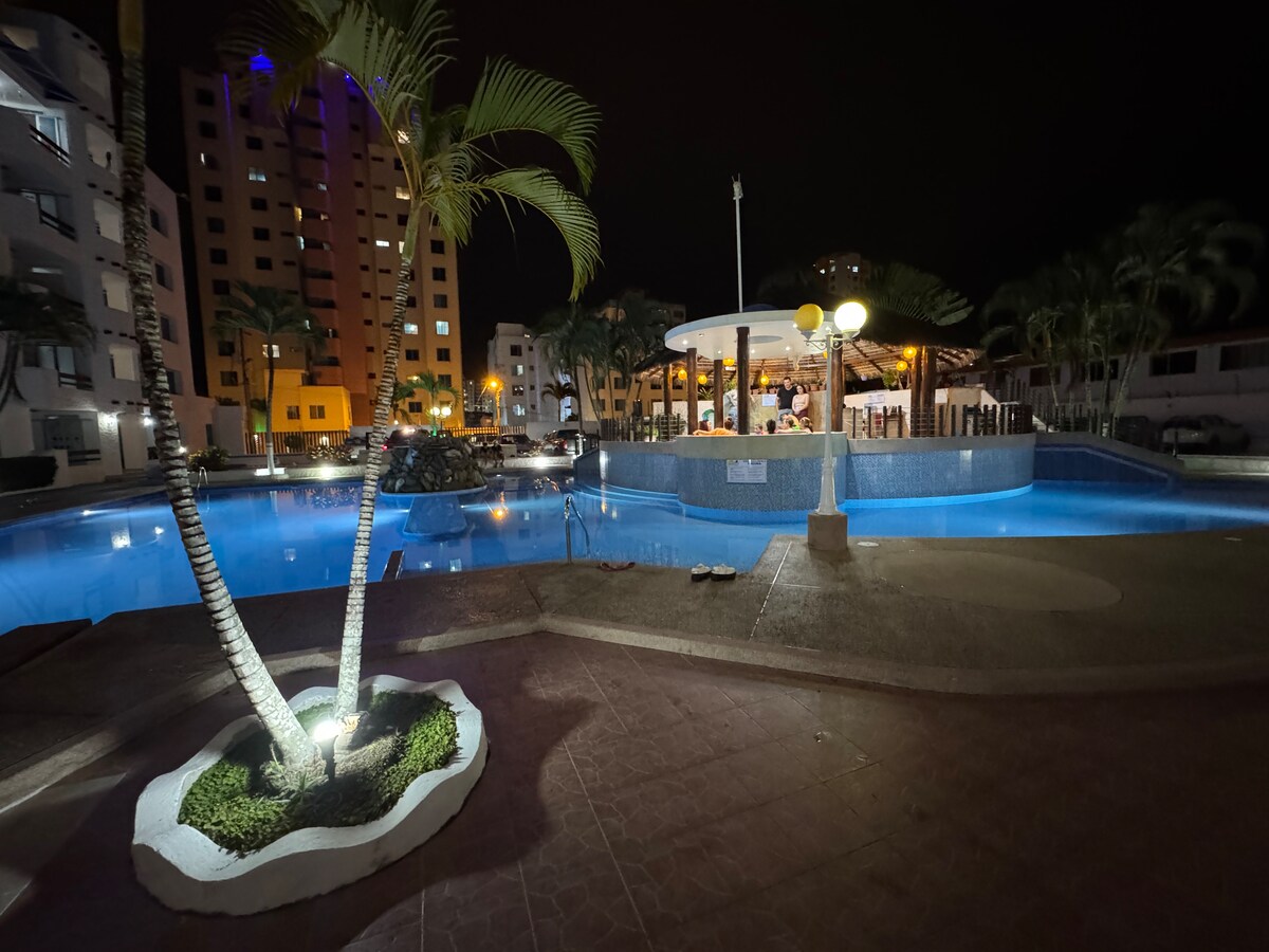 ✅ !Super anfitrión confirmado!🏆 😊!Llegaste al lugar perfecto! 🤩Vive unas vacaciones de lujo y comodidad. 🌊Vista espectacular al mar piso12 🛜 wifi & TV 💫GRATIS brazaletes 5 🏊Piscinas adultos y niños 🐶pet friendly 🌟 El apartamento cuenta con: 🛌3 habitaciones 🚾2 baños completos con agua caliente ❄️ AC 🛁Jacuzzi 🥘Cocina totalmente equipada 🍽️Comedor 🏖️Sillas de playa 🧖♂️Sauna 🏋️ Gimnasio 🚙1 parking 👮♂️ Seguridad 24/7 horas