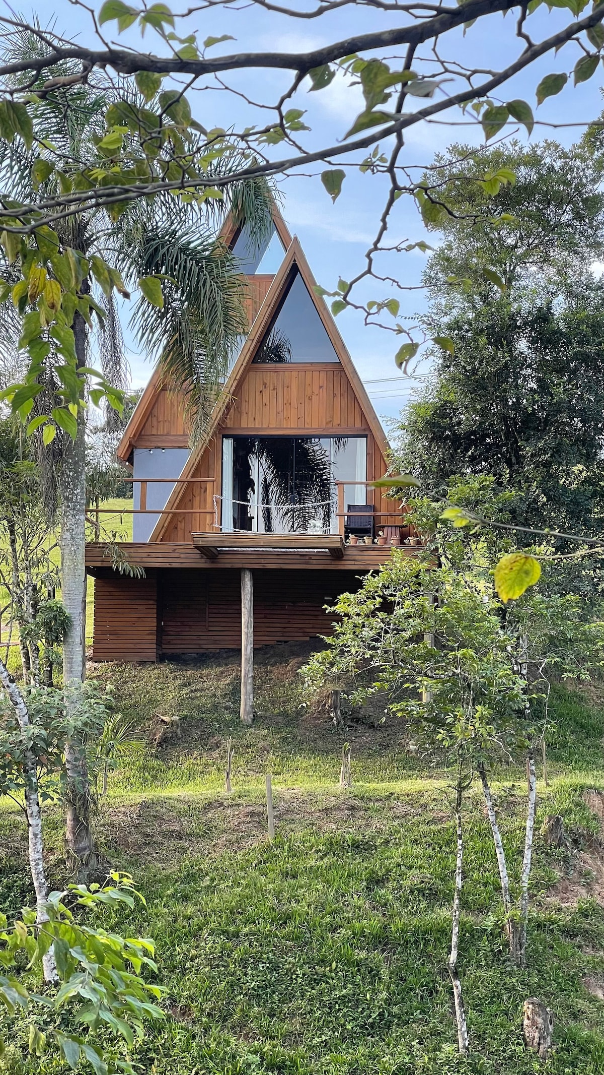 Cerca de la SERRA DO RIO DO RASTRO. Cabaña de madera rodeada de árboles y flores, cerca de un hermoso río. Donde es posible despertarse con el canto de los pájaros. Cabaña ideal para parejas que buscan tranquilidad, exclusividad y privacidad. Al relajarse en el hidromasaje durante el día, el sol entra por la abertura de vidrio y aporta una sensación de calidez y confort, con vistas al jardín y a los colibríes que suelen aparecer en el jacuzzi. Todos los grifos con agua caliente, calefacción a gas.