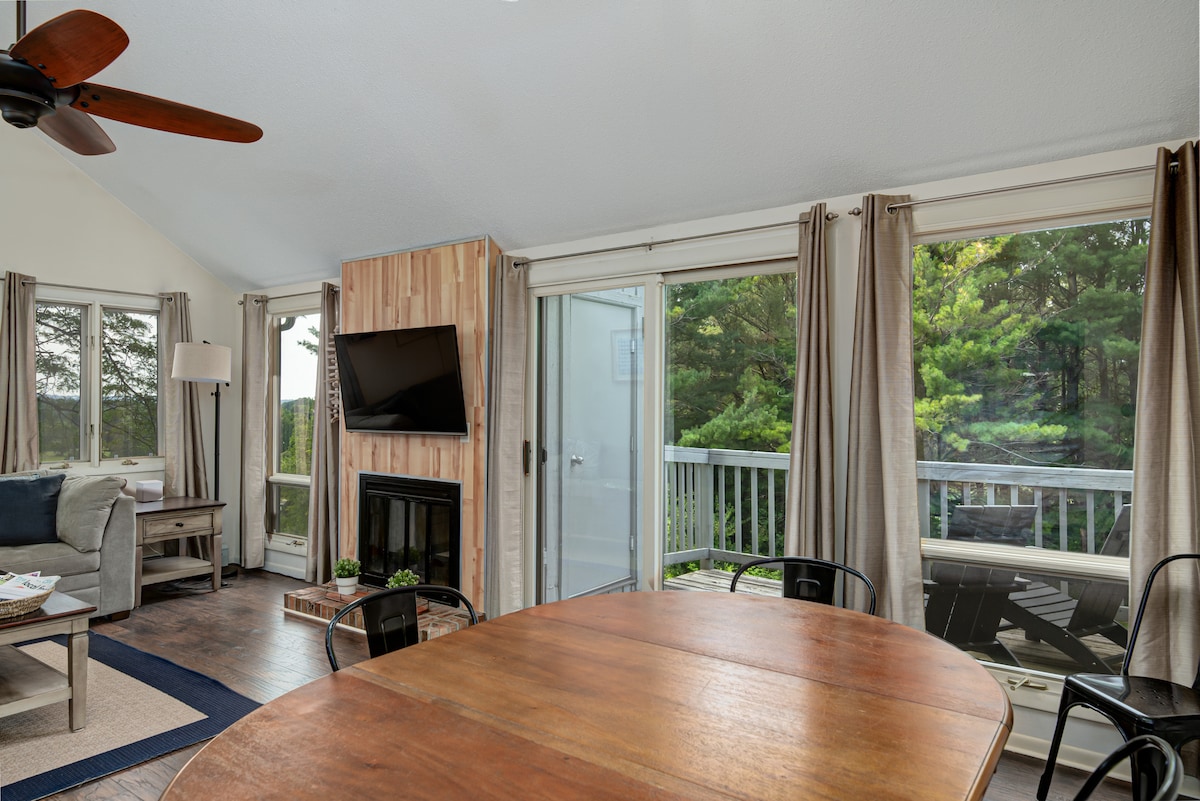 Siéntete como en casa y relájate en este apartamento tipo estudio renovado y recién amueblado en The Shores of the Grand Traverse Resort. Este apartamento frente a la bahía en el segundo piso cuenta con un balcón aislado con excelentes vistas al atardecer de East Bay. El apartamento es luminoso y está bellamente decorado. Hay una gran televisión de pantalla plana y un baño completo. La cocina pequeña ofrece microondas, nevera y cocina doble para preparar comidas calientes durante tu estancia.