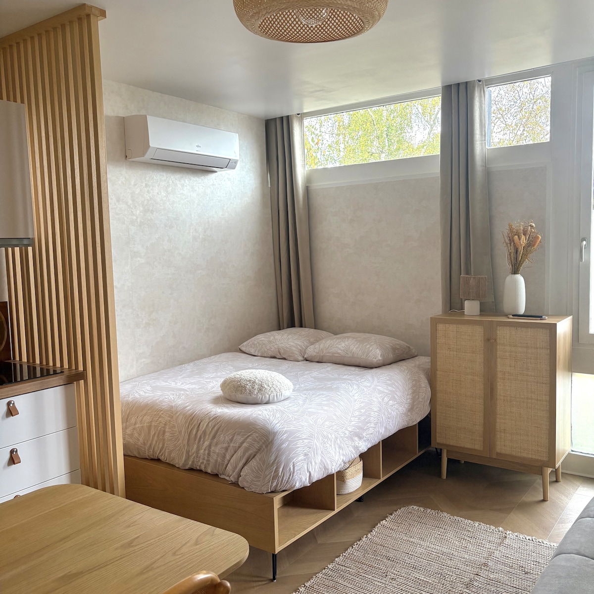 Renovamos completamente nuestro chalet en 2022 y aprovechamos para crear un apartamento independiente en la planta baja para dar la bienvenida a nuestros huéspedes (entrada privada). Consta de una cocina totalmente equipada, un inodoro separado y un baño con ducha grande. El dormitorio tiene una gran cama tamaño queen, área de trabajo y un gran armario. El chalet está en medio de una magnífica zona boscosa (6000 m2) y es un entorno muy tranquilo y silencioso. Espacios al aire libre bajo los árboles para comer y disfrutar de momentos de relajación:)