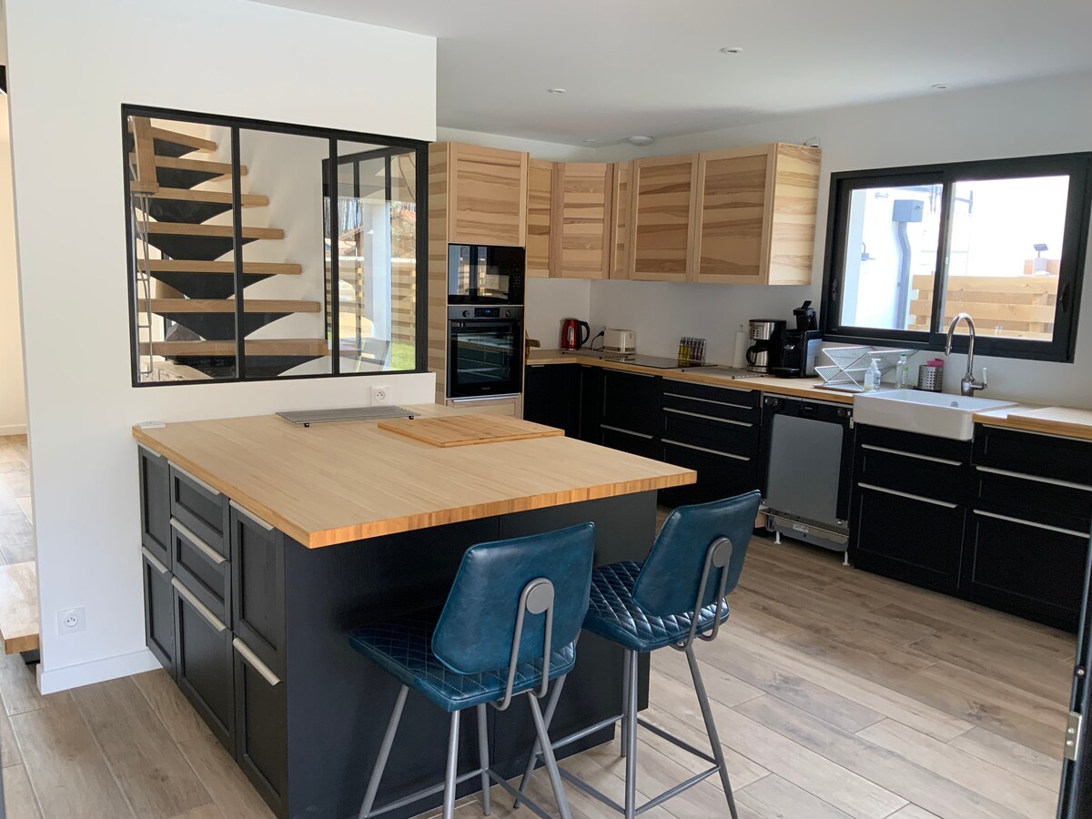 Casa nueva rodeada de bosque al lado del carril bici y las playas de la costa de las Landas Consta de una sala de estar con cocina americana, 3 dormitorios, incluyendo 1 suite principal con baño y aseo, y otro baño y aseo independiente. Fibra óptica 🛜 En el exterior, una piscina orientada al sur de 4 x 8,5 m climatizada de abril a 11 de noviembre con jardín paisajístico y 110 m2 de terraza de madera. Playa y golf de Moliets y Maa a 10 minutos Vieux Boucau a 15 minutos Hossegor a 28 minutos. Biarritz 50 min