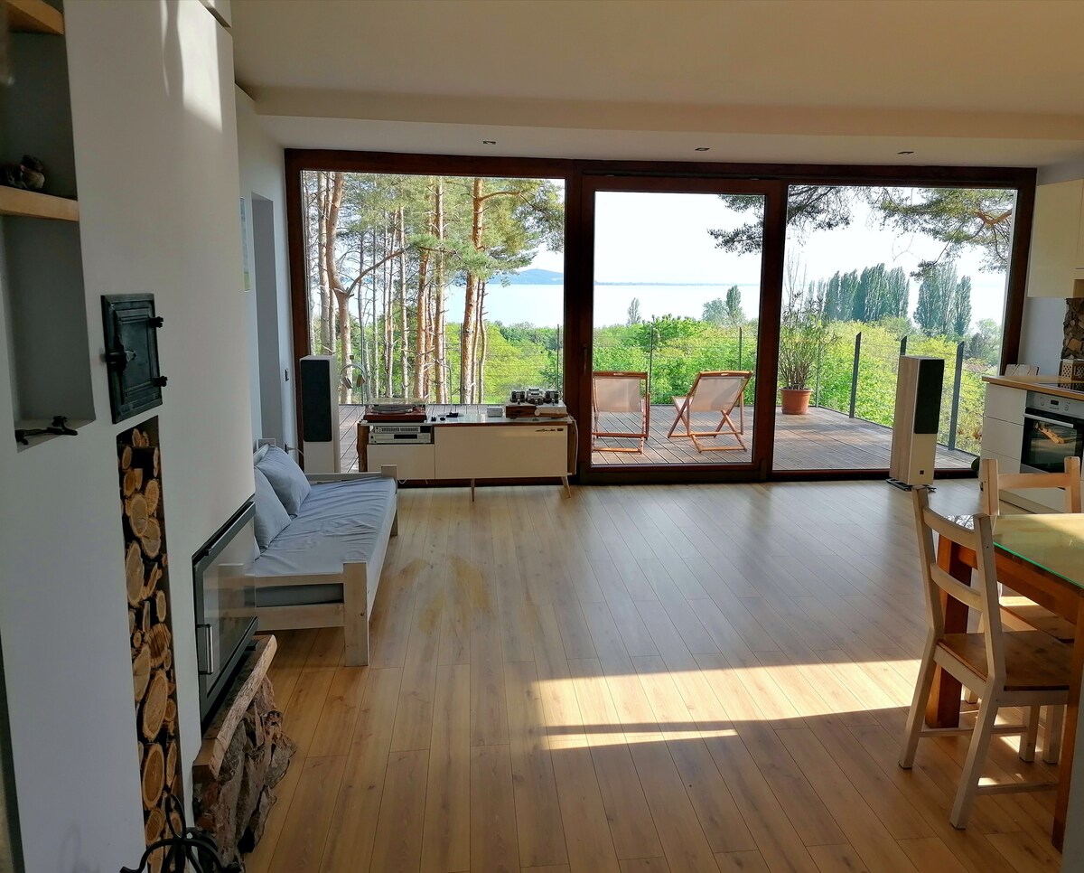 Cabin Balaton es un alojamiento donde aquellos que vienen a nosotros pueden disfrutar simultáneamente del ajetreo del lago Balaton, caminar por los bosques del Parque Nacional de las Tierras Altas de Balaton que comienzan junto a la cabaña, o incluso acurrucarse en la cama todo el día, disfrutando de la vista a través de una pared completa de vidrio, que en realidad es el bosque mismo. Todo esto en una casa de madera limpia, natural, moderna y de estilo escandinavo, a pocos minutos de las orillas del lago Balaton.