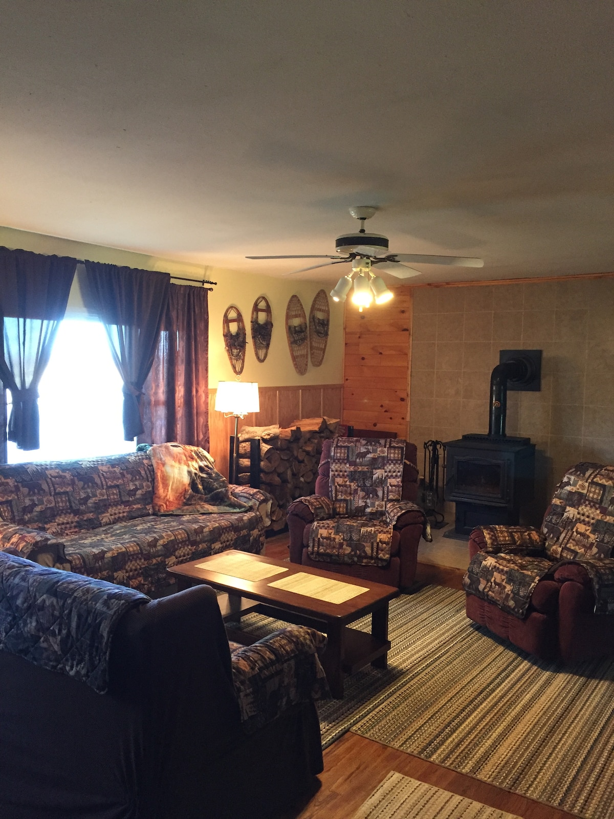 Este hermoso plano de planta abierta se centra alrededor de la chimenea de propano. Ven a sentarte en el porche envolvente y escucha a los pavos engullir. La parcela de tres acres se encuentra en los senderos para motos de nieve y vehículos todoterreno del condado de Lewis. Disfruta caminando hasta la plaza central de Brantingham y cenando o tomando una copa. Este entorno es ideal para una escapada. Senderos para caminar, campo de golf y ciclismo. Old Forge está a menos de una hora de distancia. ¡Ven a alojarte con nosotros, no te arrepentirás!