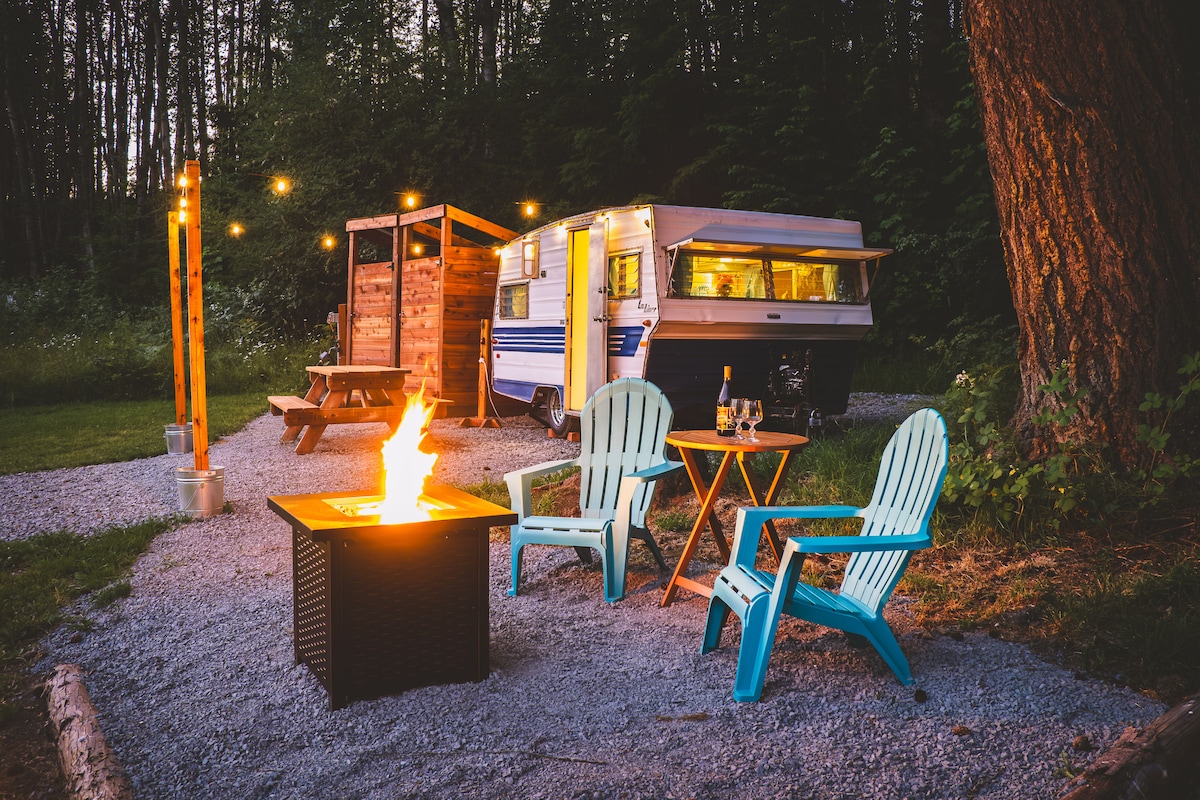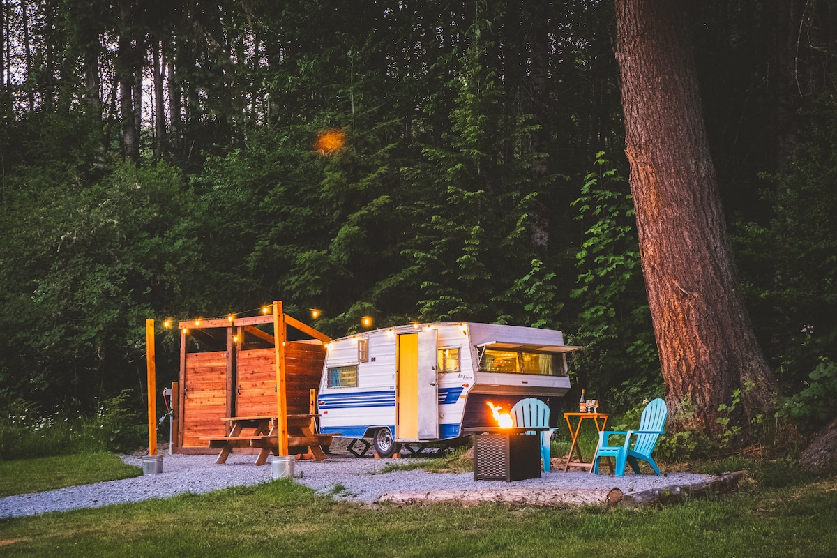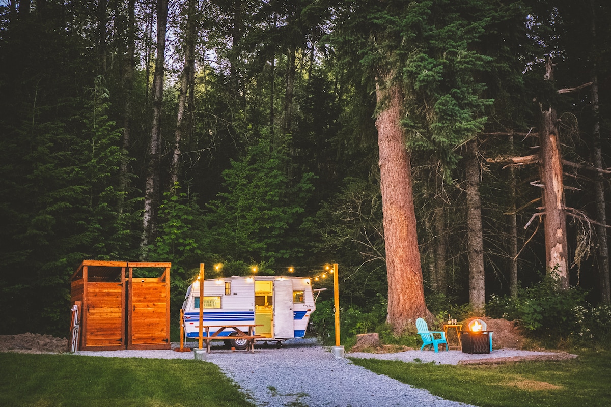 «Layla the Glamping Trailer» es un remolque de viaje Shasta de 1959 totalmente original, uno de los 4 remolques de viaje vintage en el «Ashford Lodge Vintage Trailer Glampground», ubicado en la ciudad de Ashford, a pocos minutos de la entrada del Parque Nacional Monte Rainier. Con chimenea, hamaca, ducha y baño privados, decoración retro, cocina pequeña, mesa de picnic y acceso al jacuzzi de nuestro albergue, ¡esta es la base perfecta para todas tus aventuras en el monte Rainier!