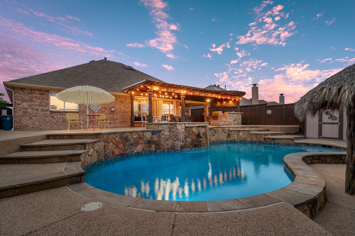 Piscina/spa climatizada única con cascada. Cocina exterior con mesa de comedor y sala de estar Mexican Palm cabana. Dentro de una gran sala de juegos para niños. Televisores en el dormitorio principal, en la sala de estar y en la sala de juegos. Ubicación céntrica a todas partes, cerca del aeropuerto DFW. El spa o la piscina solo se calientan con 24 horas de anticipación. La tarifa de gas no está incluida. Número de permiso SRT de Lewisville: STR-24-106. Not a party Venue Home, City Code - Section 9-5. Asegúrate de consultar “Otros detalles a tener en cuenta” a continuación para conocer las reglas de la casa.