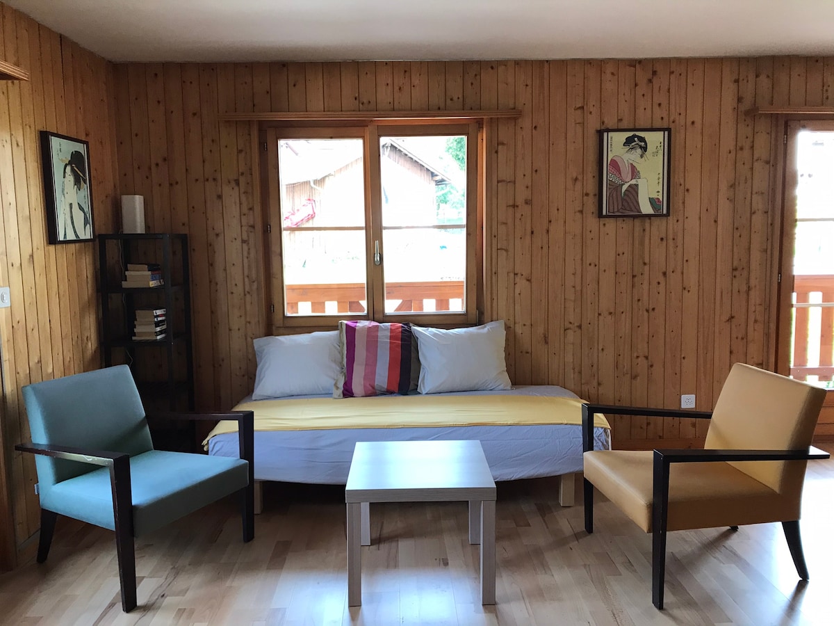 En Suiza, en el pequeño pueblo de Leysin, cantón de Vaud, apartamento-estudio en la planta baja de un chalet, 2 habitaciones de 40 m2 con wifi, sala de estar, baño con ducha, zona de sofá cama, cocina equipada con inducción y mesa de billar. Entrada independiente, terraza de 15 m2 con vistas a la llanura del Ródano y Dientes del Mediodía, una plaza de aparcamiento delante del chalet . Situado a 1300 m de altitud, a 300 metros de la estación de tren y del autobús lanzadera para llegar a las pistas de esquí y salir de excursión.