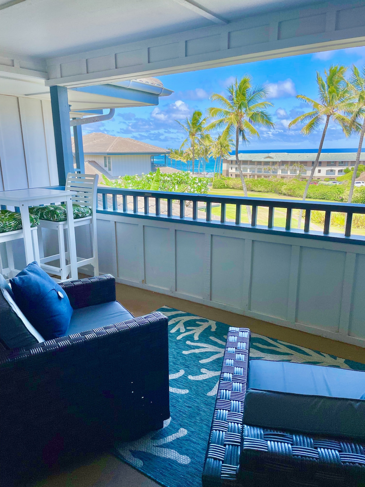 ¡Te damos la bienvenida a BluEscape Poipu! 🏝Ubicación privilegiada: paseo fácil al parque de la playa de Poipu, el Grand Hyatt y Makahuena Point. 🌅Vistas al mar: dos enormes lanais cubiertos privados, perfectos para el café de la mañana o el vino al atardecer. 🎾Ventajas del complejo vacacional: acceso a dos impresionantes piscinas, un relajante jacuzzi, canchas de tenis/pickleball. ❄️Comodidad fresca: habitaciones con aire acondicionado. Este retiro está diseñado para el espacio, la privacidad y las vibraciones clásicas de Kauai. Abarcando dos niveles con vistas al mar desde cada lanai, es la base perfecta.
