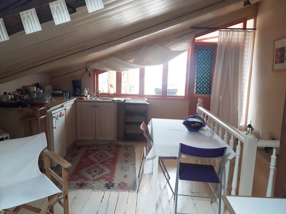 Un apartamento ático de 50 m² (dormitorio, sala de estar, baño y cocina pequeña) con jardín en la azotea de 150 m², maravillosas vistas al castillo de Palamidi y al parque central. Entre lo nuevo y lo antiguo de la ciudad. Fácil estacionamiento. Ascensor. Lugares de interés, tiendas, bares, restaurantes, bancos y playa de Arvanitia, a pocos pasos.