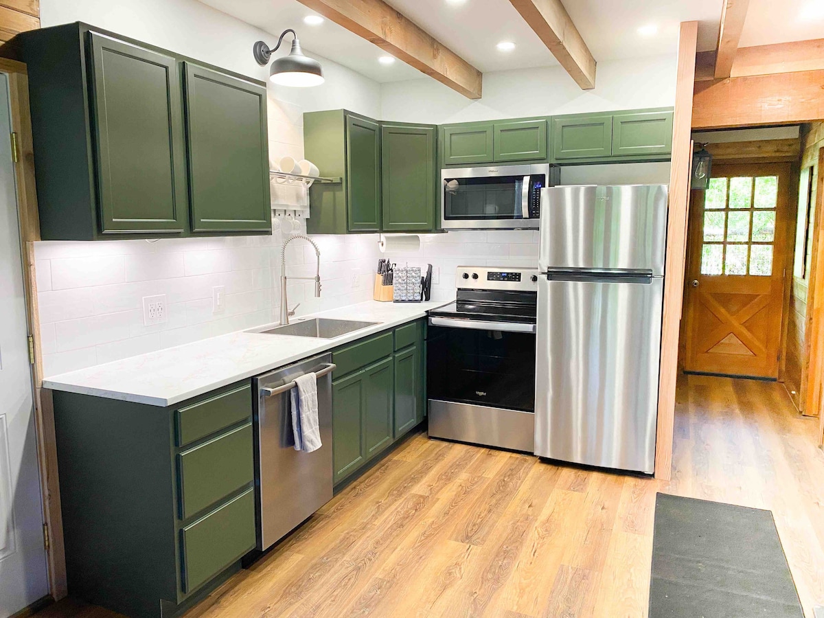 Una adorable cabaña tipo estudio de 400 pies cuadrados con cocina. Hay un dormitorio semiprivado separado por una estantería y un sofá cama de matrimonio en la sala de estar. La cocina incluye una vitrocerámica con 2 hornillas, microondas, horno tostador, nevera pequeña, fregadero y cafetera. El bar tiene capacidad para 2 personas. Acceso compartido a una parrilla de propano y a un pozo de fuego. Disfruta de las vistas a la montaña circundante desde el porche delantero. Pastoreo de caballos disponible por un cargo adicional. ¿Necesitas más espacio? Considera alquilar también la cabaña n.º 2.