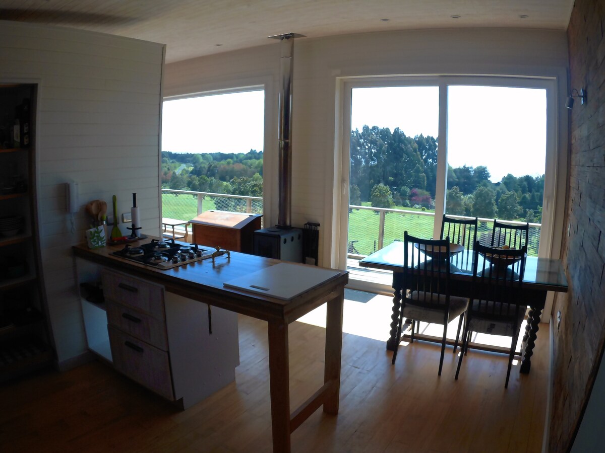 Cabaña ubicada en Molino Viejo, sector rural entre Puerto Varas y Llanquihue, con espectacular vista al lago Llanquihue y los volcanes, además de la vegetación característica del Sur. Ideal para una o dos parejas solas que quieran escapar de la ciudad y descansar en un lugar tranquilo.