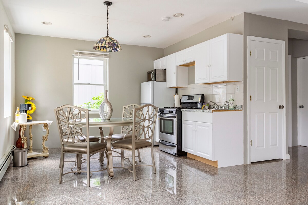 ** Las ESTANCIAS MENSUALES SON BIENVENIDAS** Este estudio extragrande APTO PARA MASCOTAS en la planta baja/sótano ofrece un espacio limpio y cómodo, baño de spa, cocina, TV inteligente y amplio espacio en el armario. También viene con un ENORME patio trasero equipado con una hamaca, hoguera y áreas de comedor/descanso. Los servicios al cliente también están disponibles (consulta tu libro de bienvenida una vez reservado). Aparcamiento privado gratuito, fácil registro de entrada, a 30 minutos de Nueva York; a 7 minutos de los lugares de moda. Entrada/salida anticipada/tardía: $ 70 cada uno. Tarifa por mascotas: $ 100 por mascota.