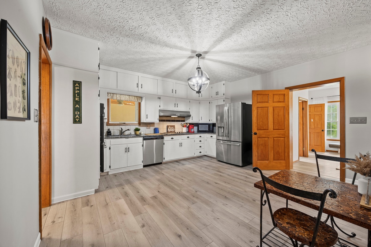 ¡Bienvenido a Country Living! Vivimos en un terreno sereno de 12 acres en el país a pocos minutos de la I-70 (salida 79 E con destino/salida 85 W con destino). Ofrecemos un apartamento limpio y acogedor en el nivel inferior con entrada privada, 2 dormitorios/1 baño, cafetería/cafetería con una variedad de refrigerios, té y café, una sala de estar, sofá reclinable, mesa de billar, chimenea eléctrica, RokuTV, mesa pequeña/2 sillas y un área de patio al aire libre. Estamos ubicados en una granja familiar de 250 acres con un sendero para caminar, bosques, arroyo y cabaña.