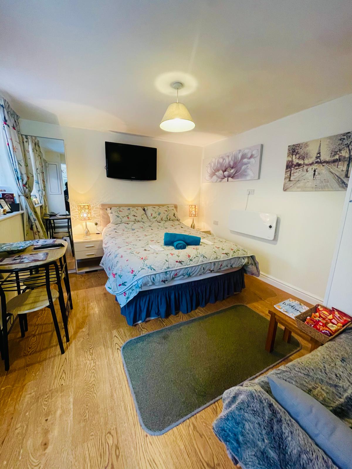 Nuestro apartamento en la primera planta ofrece una habitación con dos camas individuales con baño con ducha, cocina, internet, TV y calefacción por suelo radiante. Aspecto soleado con ventanas a ambos lados. Vistas al jardín y al campo. La casa está situada a unos 100 metros de la carretera y, por lo tanto, es tranquila. Tiene mucho aparcamiento fuera de la carretera y una parada de autobús en el exterior. A menos de 400 yardas tenemos un pub, restaurantes chinos e indios, cafeterías y quioscos. El supermercado más cercano está a una milla de distancia.